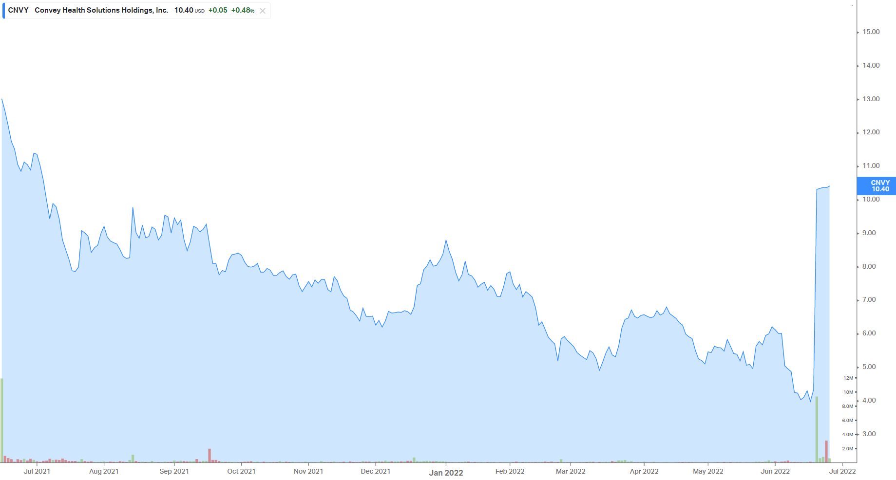 TPG takes Convey Health Solutions Private at $1.1B Valuation: TPG Capital, a major private equity player, announced its intention to take Convey Health Solutions private at $10.50 per share. The value amounted to $1.1 billion, a 143% premium to Convey's last close, and about a 100% premium to Convey's VWAP, or volume-weighted average price per share as of a recent date to the transaction announcement. TPG previously invested in Convey, took them public at $14 per share and now is taking them private again at $10.50. Premier Inc. spikes on acquisition rumors: Premier Inc spiked on reports of private takeover interest, although this flew under the radar quite a bit. |