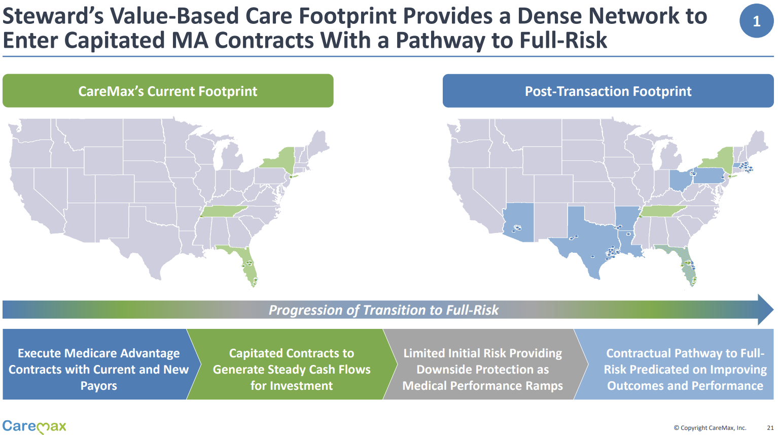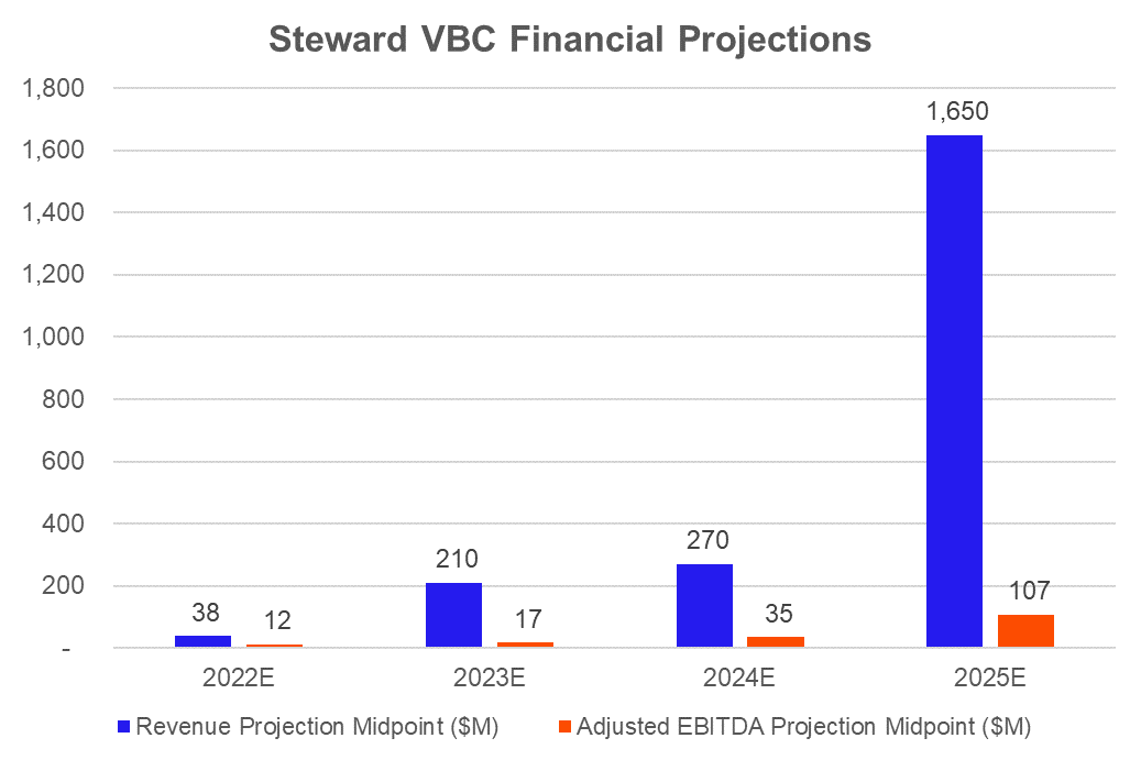 In one of the more significant value-based deals announced in 2022, CareMax announced the acquisition of Steward Health Care's Medicare Advantage business, comprised of 171,000 lives across 8 states. The deal creates one of the largest independent MA-focused value-based platforms in the U.S. and will close sometime in the back half of 2022. Deal structure: CareMax acquires Steward's MA service line (Steward VBC) for $135 million in cash and stock. The value-based player will now serve as Steward's exclusive management service organization (MSO) for Steward VBC. As part of the deal structure's earn-out provisions, CareMax will need to convert an additional 100,000 FFS lives to risk and will have to maintain an 85% MLR for two consecutive quarters to maximize the provisions. Steward Gets: $25 million in cash, 21% CMAX ownership immediately, and up to 41% ownership in CareMax equity (if earnouts are achieved). Steward also offloads $72 million in VBC A/R offloaded to CareMax, a very non-significant working capital value that CareMax is now funding. CareMax Gets: Access to 50,000 MA lives, 112,000 MSSP lives, and 9,000 direct contracting lives, along with the opportunity to convert 830k+ additional members to risk, along with some of the best ranking and performing ACOs nationally. CareMax identified the transaction as a $1.6B to $1.7B revenue and $100M to $110M EBITDA opportunity (implied 6-7% margin) by 2025, assuming pretty rosy projections I detailed more below. The firm's total value-based footprint would jump to 2,000 providers across 200,000 senior lives in 30 markets. |
