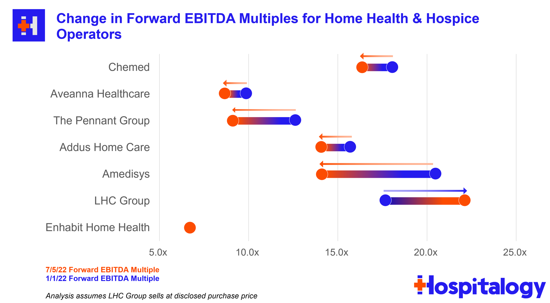 Since Enhabit operates at a lower cost per visit than Amedisys and LHC Group as of CY 2021 and holds solid readmission percentages, the firm believes it's in good shape to serve the Medicare Advantage population as it continues to grow to above 50% by 2030. Final point - Timing for the spin-off wasn't exactly ideal given what's going on in the broader economy as well as the idiosyncratic struggles home health operators are facing. These issues are probably one of the major reasons why LHC decided to sell to Optum for 22x EBITDA back in late March. Really timing the top there! Home health multiples continue to be hammered given the current macro outlook for these operators. This week, Aveanna was downgraded by equity analysts and dropped another 7%. Meanwhile, Enhabit (Encompass spinoff) continues to get hammered and dropped under a $1B market cap while trading at a sub-7x EBITDA multiple. |