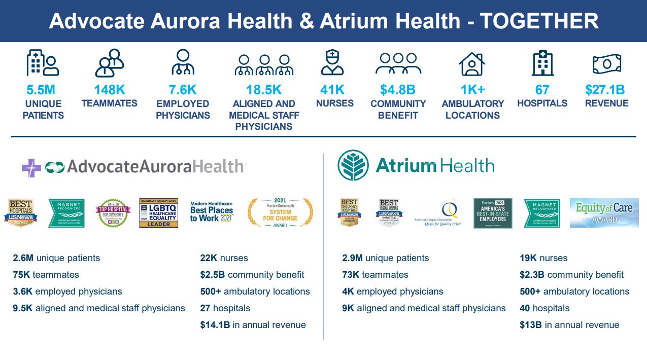 Advocate Aurora Health is merging with Atrium Health to create a $27 billion health system which will operate under a new name: Advocate Health. The new system's combined revenues puts it on par with that of Ascension & Providence at about $27 BILLION - good enough for the 6th largest health system in the U.S. Advocate's new footprint will include: - 67 hospitals