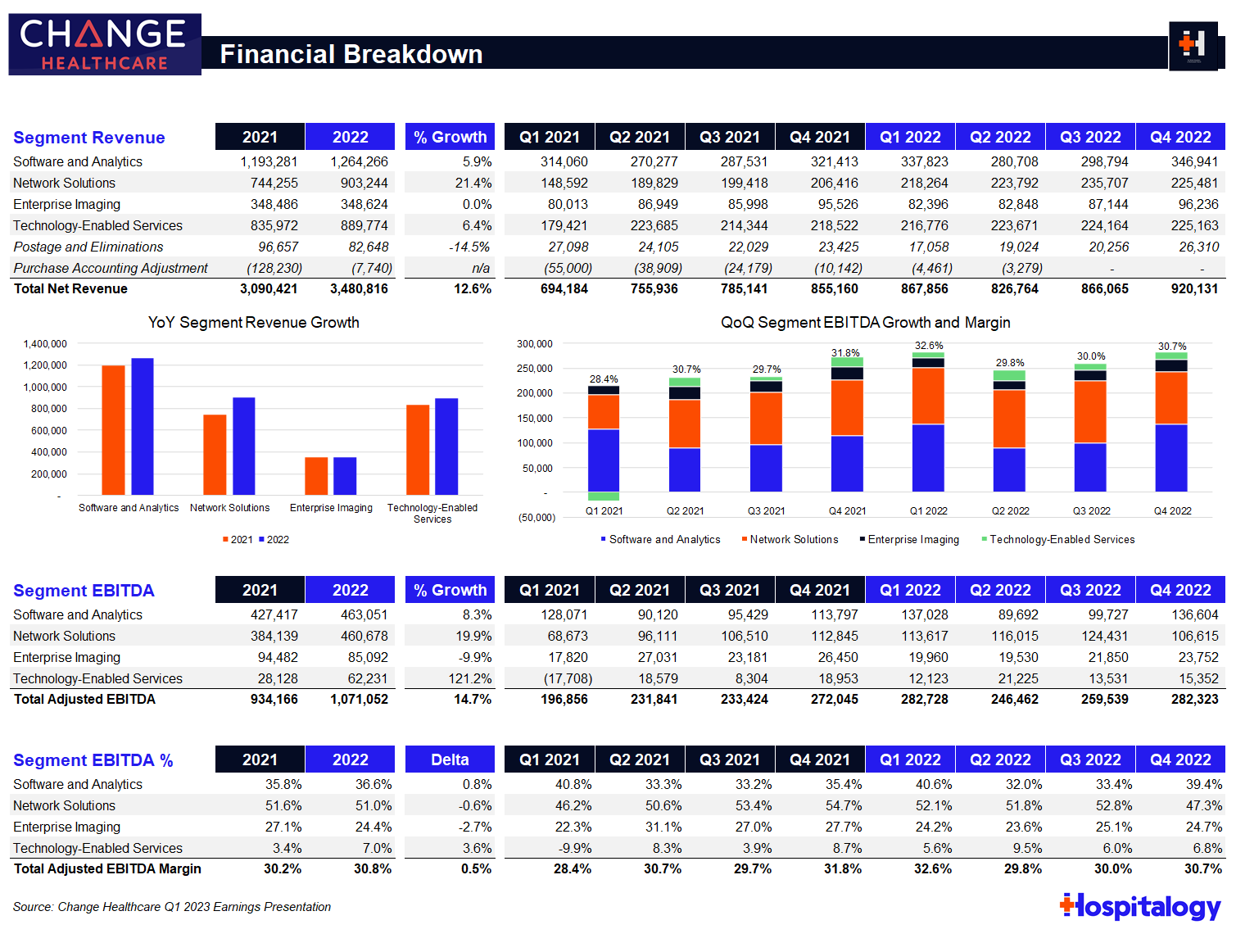 Madden's Musing: I'm still wondering why the court briefs were sealed. But regardless, assuming no hiccups from this point, Optum will finally get to integrate Change Healthcare into its OptumInsight (analytics, rev cycle, & data platform) arm, which did $12.2B in revenue in 2021 and ~$12.9B in the last twelve months ended June 30, 2022. Change Healthcare generated around $3.5B in revenue in its FYE March 2022 (seen above) but part of that will get divested as the judge ordered UHG to sell Change's ClaimsXten biz to TPG Capital for around $2.2B. It goes to show just how tough it is to prevent mega-mergers on this level by insurance giants. Change Healthcare processes $1.5T (yes, with a T) claims through 15B transactions with 6,000 hospitals and 1,000,000 physicians. Given that OptumInsight is one of the largest providers of healthcare IT services in hospitals nationwide, the Optum-Change combination creates a formidable, pretty much untouchable, entrenched incumbent. Every other health insurer would have to work through Change/Insight once the deal is closed. United continues to successfully execute on its strategy to focus on Optum as its growth engine for decades to come as it quietly acquires physician groups across the country. It's building an untouchable empire. Resources: |