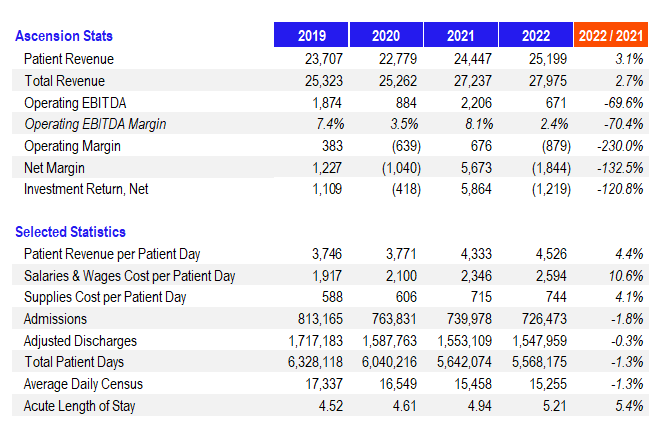 Top-5 nonprofit health system Ascension released its full year (MH paywall) 2022 financial and operating results on September 14th, and the trend of hospital losses marches on. Common themes continue to plague even the largest operator financial and operating performance. Investment losses aside, Ascension's operating margin totaled ($879M) while its total net margin dropped to ($1.84B). Operating EBITDA dropped to $671M, or 2.4%. |
