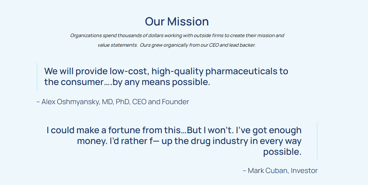 In fact, Mark Cuban wasn't interested in investing in Oshmyansky's vision for Mark Cuban Cost Plus Drugs (MCCPD) until the model switched from a 501(c)(3) nonprofit org into a public benefit corporation. The initial vision of MCCPD wouldn't exist at all without a PBC structure. From the D Magazine feature, the difficulties in starting without any sort of investment or equity incentives is impossible: