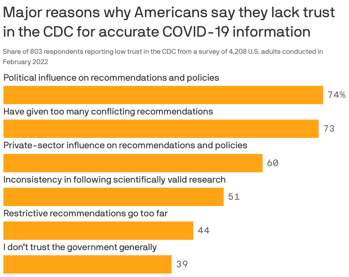 Data: SteelFisher, et al., 2023, "Trust In US Federal, State, And Local Public Health Agencies During COVID-19: Responses And Policy Implications"; Chart: Axios Visuals People who tended to report lower trust in public health agencies like the Centers for Disease Control and Prevention during the pandemic believed those agencies' health recommendations were politically influenced and inconsistent, according to a study published Monday in Health Affairs. Why it matters: While plenty of studies throughout the pandemic tracked levels of trust or sought to break it down by demographic groups, this study sought to understand factors that led to higher or lower trust levels. The big picture: Public health officials at all levels have been examining how to restore public trust in health agencies. The CDC, in particular, has responded to intense scrutiny over its response to public health threats and communication missteps with a plan to overhaul its internal structures. By the numbers: The Harvard-led study surveyed more than 4,208 U.S. adults in February 2022. Among those who said they had high trust in the CDC, the top reported reason was that they believed the CDC followed scientifically valid research (94%) and have the expertise (92%). - Those who reported low trust in the CDC were more likely to report a belief their recommendations were politically influenced (74%) or were influenced by private industry (60%).