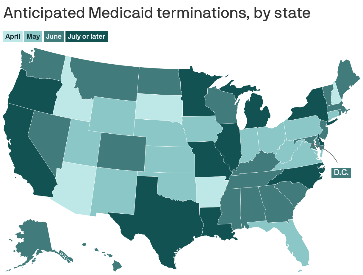 Data: Center for Medicare and Medicaid Services; Chart: Tory Lysik/Axios Visuals Thousands of Pacific Islanders who went years without promised Medicaid coverage before Congress made amends during the pandemic could lose those benefits this spring in the first wave of eligibility redeterminations, Arielle writes. Why it matters: States are culling their Medicaid rolls with the end of the COVID-19 emergency, removing guarantees of continuous coverage that reduced health inequities in ways obvious and not-so-obvious. Zoom in: Consider the 94,000 individuals from the Marshall Islands, Palau and the Federated States of Micronesia now living in the U.S. While non-citizens, they're guaranteed Medicaid and CHIP benefits under a Reagan-era agreement that gave the U.S. exclusive use and control of sites in those islands for military activity. - Congress erroneously stripped the group's Medicaid benefits when drafting welfare reform legislation in 1996. That left communities exposed to the ravages of COVID-19 more than other groups before Congress restored the benefits in a year-end spending package in 2020.