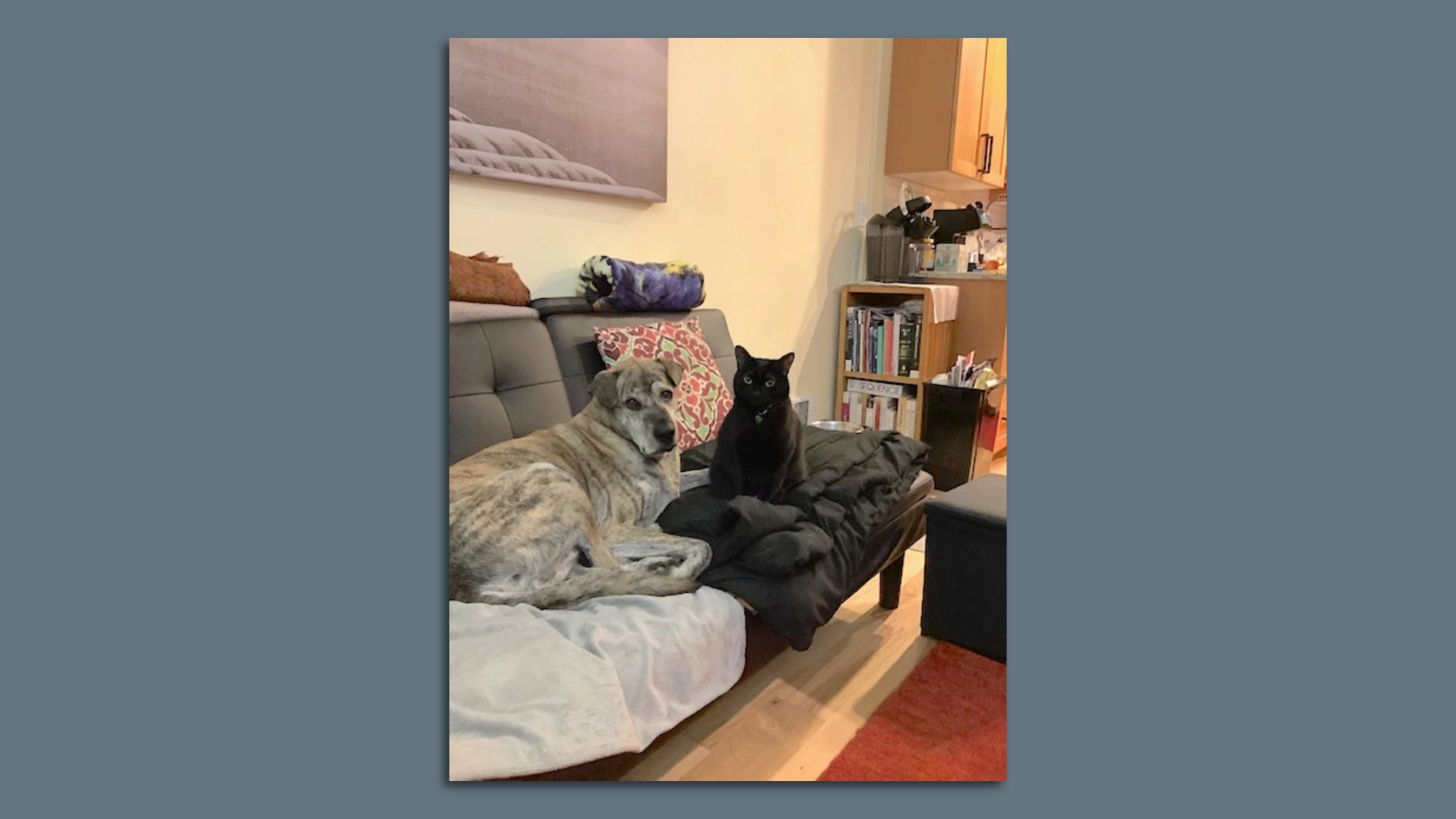 | Meet Maddy, a 9-year-old rescue dog rescued from an animal shelter in Lincolnton, North Carolina, and Anya, who was found roaming the streets as a kitten in Charlotte. They now spend their days enjoying indoor creature comforts together in Bellingham, Washington. - "They aren't exactly pals but have achieved a modus vivendi," writes their human, Martin Cooper.