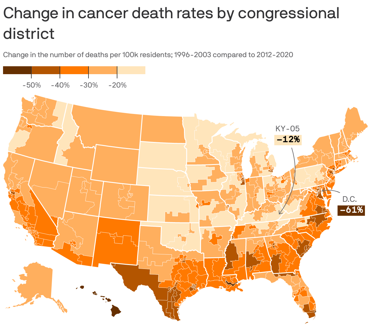 Data: American Cancer Society; Note: Death rate is computed as the average of the male and female rates; Map: Erin Davis/Axios Visuals Cancer deaths are on the decline in every congressional district, typically between 20% and 45% among males and a 10% and 40% among females, over the past quarter century, according to a study published today in the journal Cancer. - But health disparities remain.