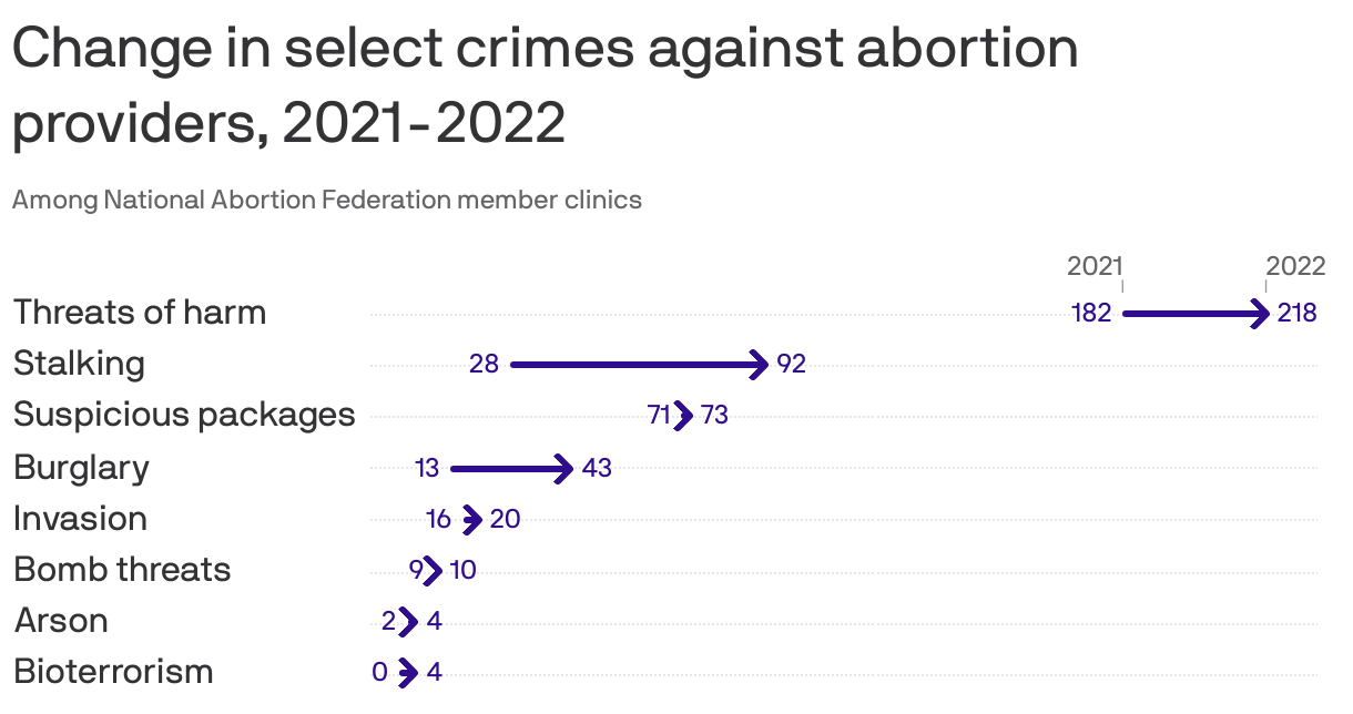 Data: National Abortion Federation's 2022 Violence & Disruption Report; Note: 80% of member clinics reported data. Chart: Axios Visuals The Supreme Court's decision to overturn Roe v. Wade was followed by a "sharp increase" in violence directed against abortion providers and patients, according to a new report from the National Abortion Federation, Axios' Oriana González writes. Zoom in: The report found that states that protect abortion access saw a "disproportionate" increase, including a ninefold increase in reported cases of stalking, a doubling of burglaries and a 29% increase in assaults and batteries from 2021 to 2022. - Bomb threats also increased in these states by 133% and obstruction rose more than fivefold.