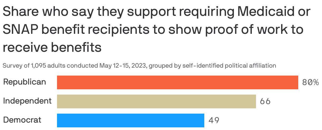 Data: Axios-Ipsos poll; Chart: Jared Whalen/Axios Nearly two-thirds of Americans — including half of Democrats — back attaching work requirements to Medicaid and Supplemental Nutritional Assistance Program benefits, as House Republicans want to do in a debt limit deal, Axios' Adriel Bettelheim writes from the latest Axios-Ipsos American Health Index. Why it matters: Work requirements are a major sticking point in debt ceiling talks. - President Biden on Wednesday reiterated his opposition to imposing them when it comes to health care, but the new findings show how popular, at least on the surface, the idea is with Republicans and independents — and how it divides Democrats.