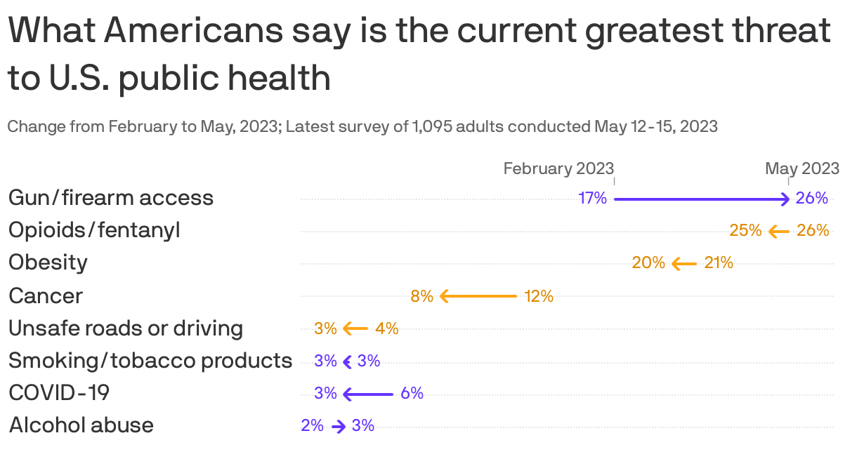 Data: Axios-Ipsos poll; Chart: Jared Whalen/Axios The Axios-Ipsos poll also found gun violence has surged ahead of the opioid crisis as Americans' top public health concern, Adriel writes. Zoom in: 26% of respondents said "access to guns or firearms" is the No. 1 threat to American public health, up from 17% in our last poll in February. - 25% said the biggest threat is opioids and fentanyl, virtually unchanged since the last poll.