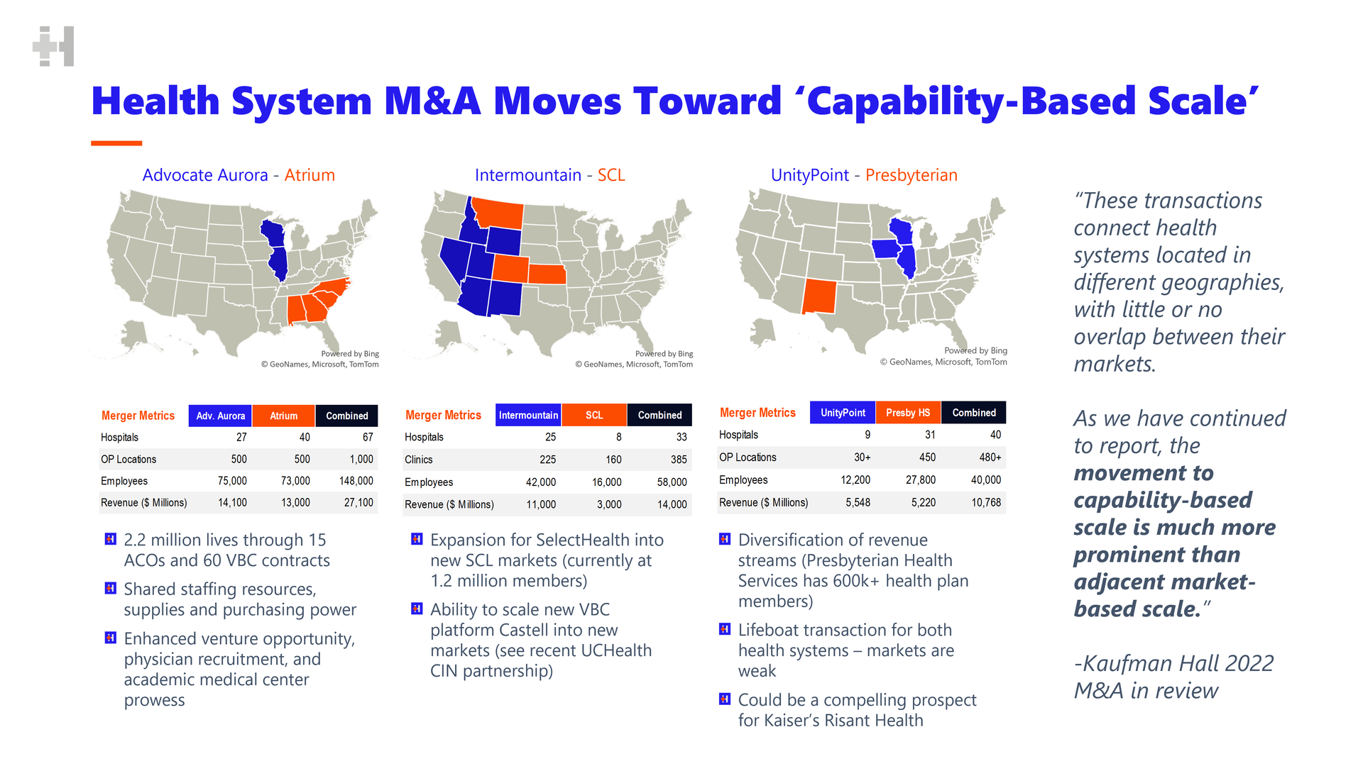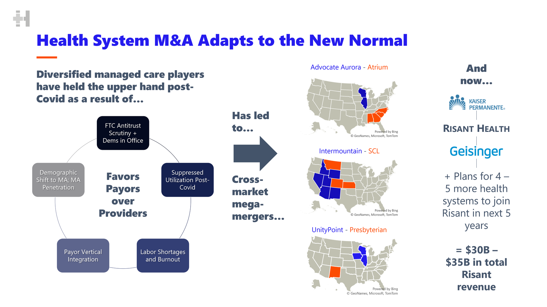 Risant Health's formation picks up perfectly where we left off in 2022 with cross-market megamergers (Advocate-Atrium in particular) and the evolution of hospital M&A. And it's a perfect, natural response to current health system headwinds. The old heads in beds playbook isn't working - at least not right now. Health systems don't know what to do operationally - they're stuck. Everything seems too risky. Risant is swooping in at the perfect time to save the day. Kaiser is extending an olive branch to health systems that are likely panicking in the face of uncertainty. Right now I imagine some health system leaders are looking up and thinking "Well, I could create a lot of legwork for my team, involve a bunch of lawyers and consultants, and set up a cross-market JOC for scale or go at our new expansion projects alone… "…or I could join Risant, which is already pre-baked and has Kaiser-Geisinger in the mix, with the promise of guaranteeing some of my future capital needs/project pipeline and expanding my population health growth strategy." I mean, that's what I'd be thinking but I'm not a health system exec! |