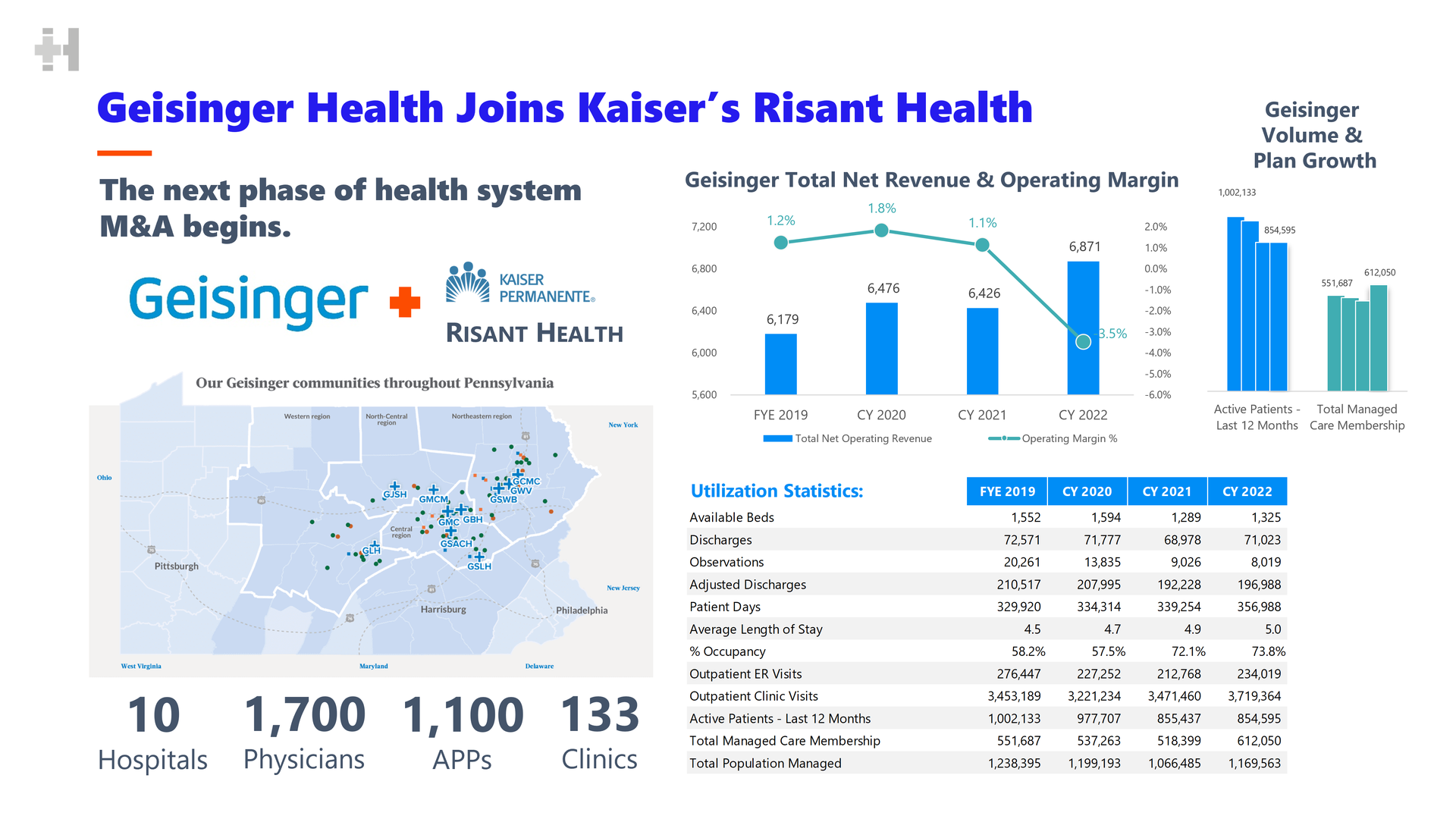 As the first mover into Risant, Geisinger holds an impressive footprint including $6.9 billion in revenue, 600,000+ managed care members, 10 hospitals, 1,700 physicians across 133 clinics, and has been referred to as the 'Kaiser of the East.' It's a smart cultural fit and the perfect Risant constituent: |