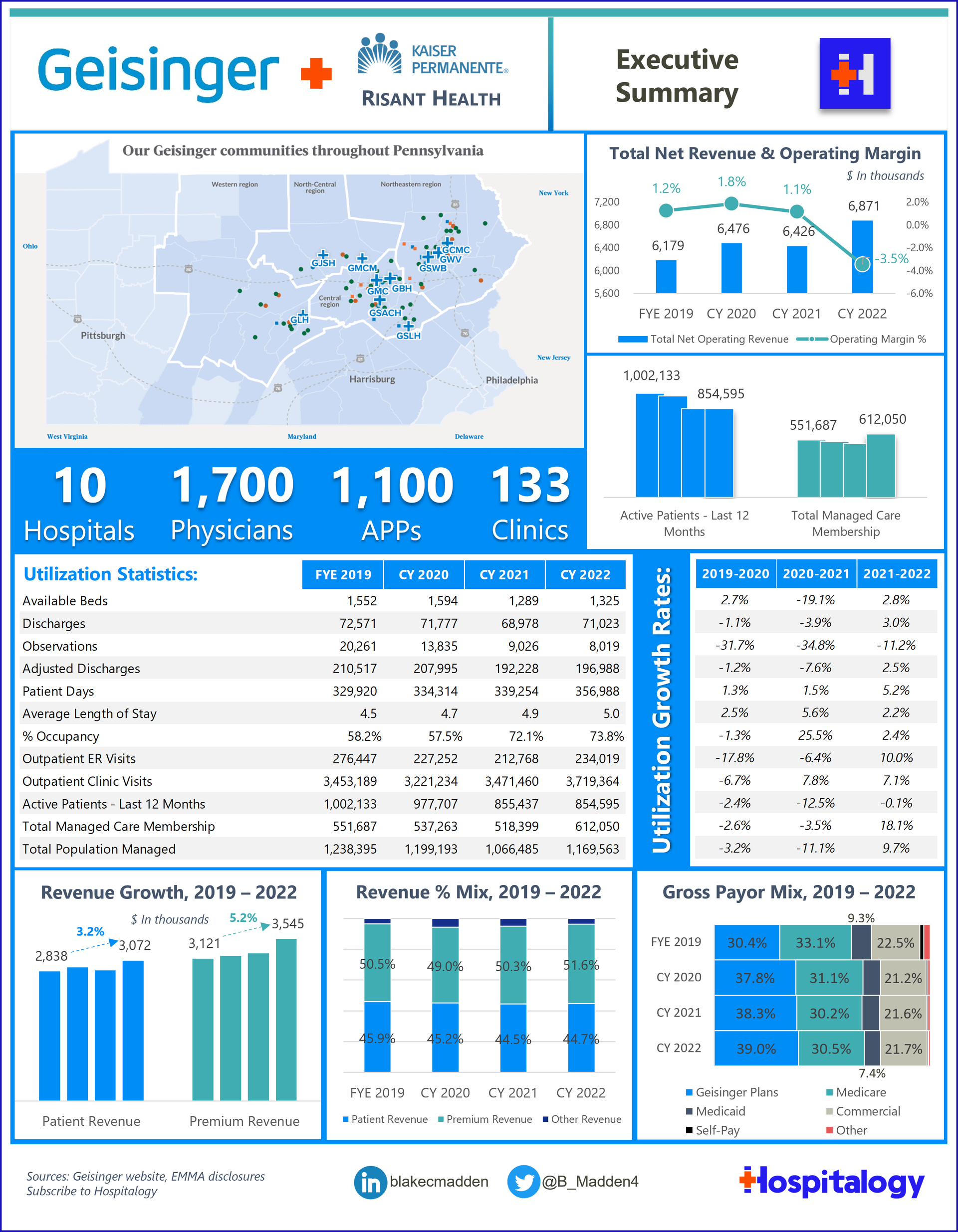 So from the financial disclosures, it sounds like Risant will pool together member resources and cashflow, then Kaiser as the parent organization will provide its deep pockets to also fund capital projects and provide population health expertise. These promises are exactly why Geisinger joined Risant as the premier acquisition. Geisinger was facing static volumes, competitive threats from the likes of UPMC , and subsequent potential credit downgrades from sustained, low-margins: |