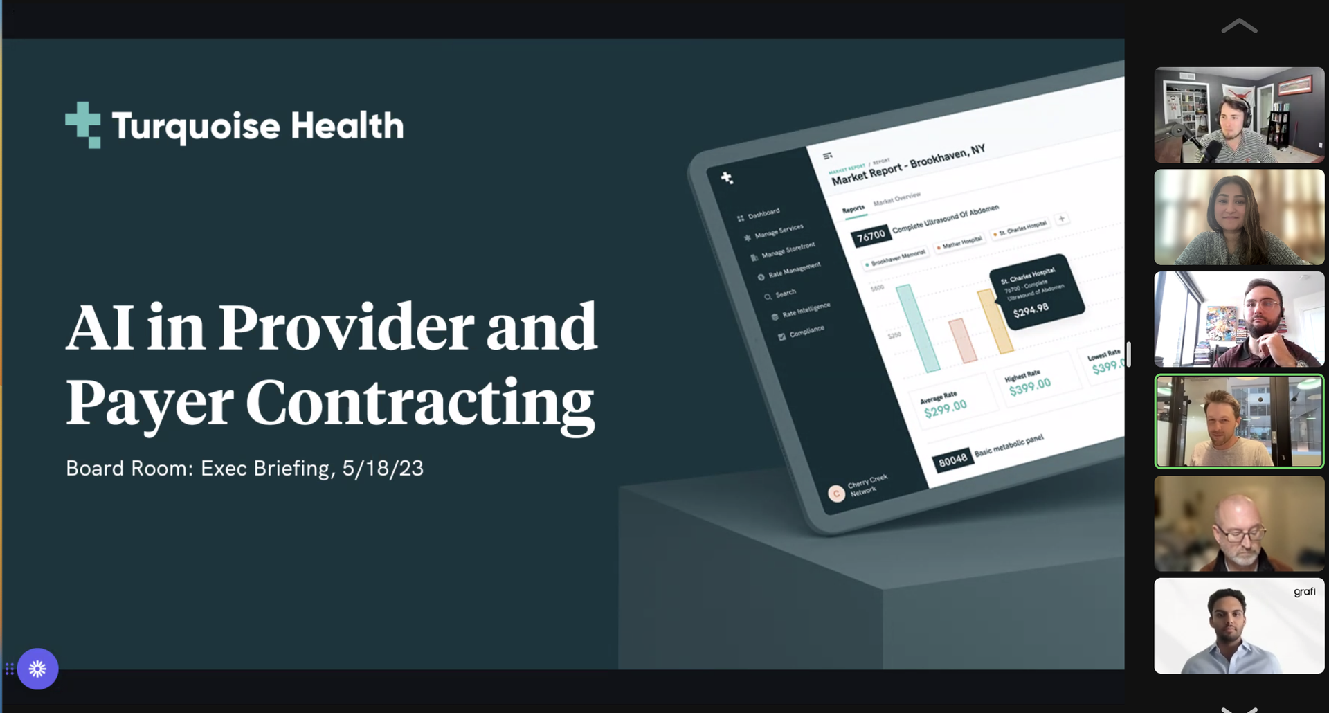 Today the Board Room held its monthly executive briefing talking about AI in healthcare - frameworks for generative AI, use cases for AI in payor and provider contracting, and learning more from industry personnel. I wanted to give a special thanks to Sean Sodha from Grafi.ai and Chris Severn from Turquoise Health for fielding questions from the community and sharing their insights on where AI is headed. I really enjoyed the discussion as I'm mid-sneeze or something in the screenshot below! |