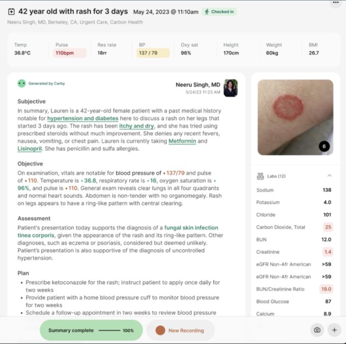 Digital Health and Startup Updates:     Carbon Health has introduced a new AI-enabled feature for hands-free charting, designed to streamline documentation and enhance patient-provider interactions during healthcare visits. (Link) -   Alex Cohen shared an example of the generative output in a tweet which looks like most other generative AI interfaces I've seen out in the wild, but I'll be interested to see the effects of it on an organization as large as Carbon and implemented across the organization immediately.