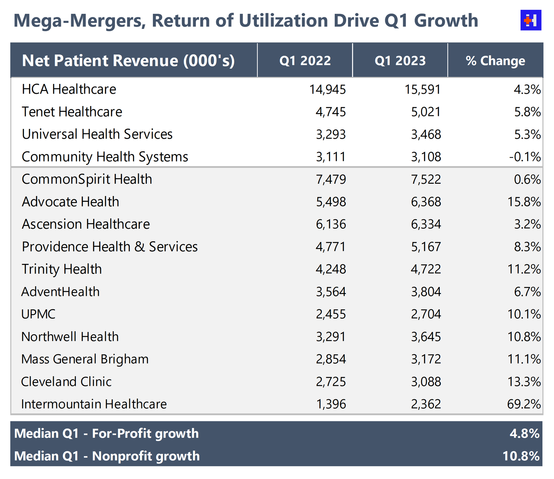 To continue with hospital financial data, I took a quick look at hospital Q1 net patient revenue growth. The below table compares Q1 '22 to Q1 '32 direct patient revenue growth for some of the largest health systems. Based on the below in addition to public commentary from HCA and Tenet, the biggest players seem to be signaling increased utilization and growth headed into the back half of the year.  |