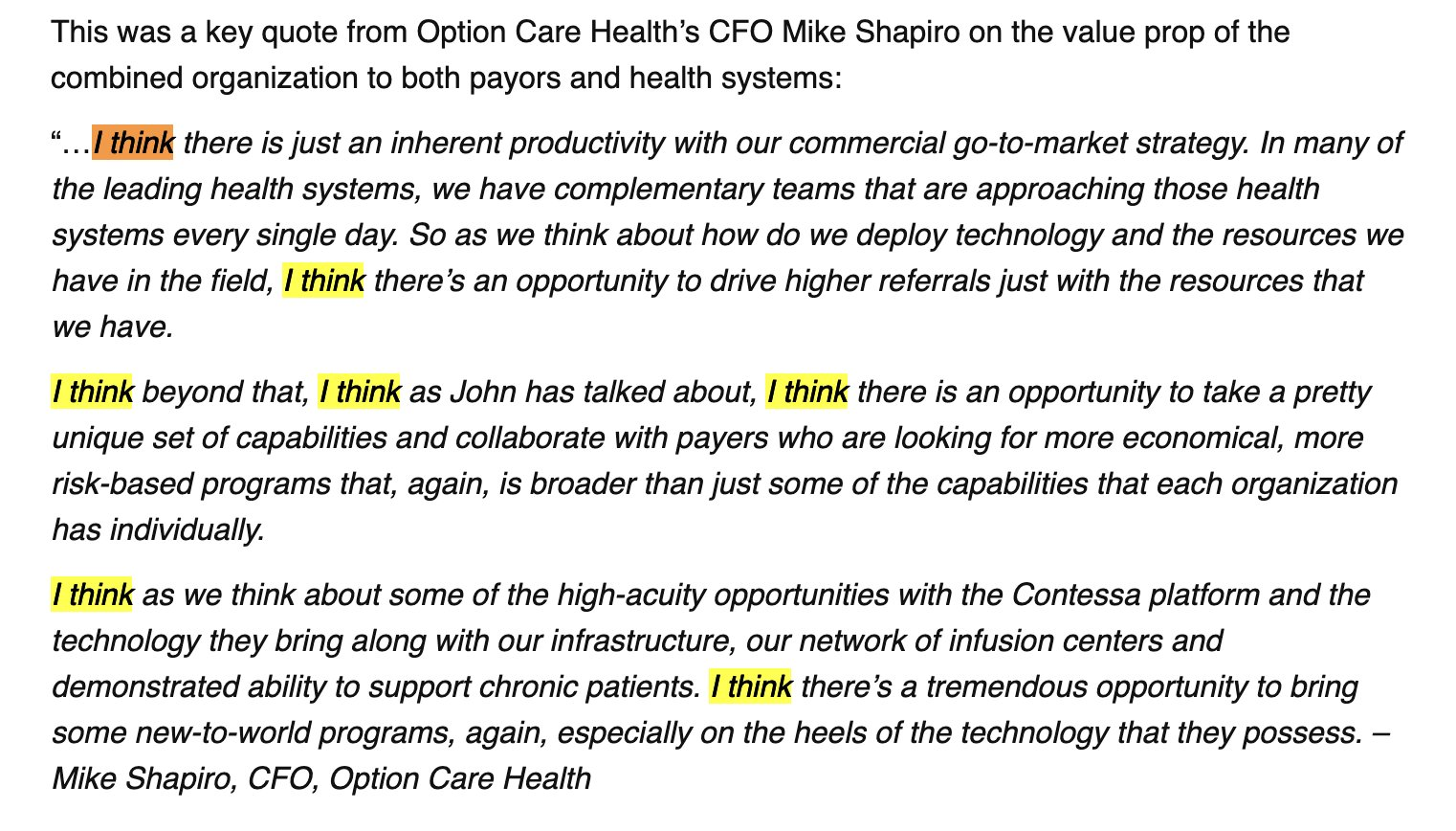 UnitedHealth Group is once again coming for a major home health player. After Option Health Care in early May announced its intention to merge with Amedisys in a deal valued around $10 billion (Amedisys comprising around $3.6B of the combined enterprise at the time), Optum announced an offer to acquire Amedisys outright in an all-cash deal at $100 / share.     Blake's Take: The Optum announcement could present an opportunity for both Amedisys and Option Care shareholders to back out of the original offer. For one, analysts were highly skeptical of the original combination here, with lack of payor overlap or other immediate synergies. There was so much skepticism, in fact, that Option Health Care had to post a follow-up support post along with all of their buddies sharing all of the positive attributes from the announced deal. Has anyone seen anything like this? Is this a normal thing?   And when the CFO says "I think" 7 times in one quote during the merger call it might be time to rethink the strategy. I'm not picking on the quote but…signals, ya know?  |