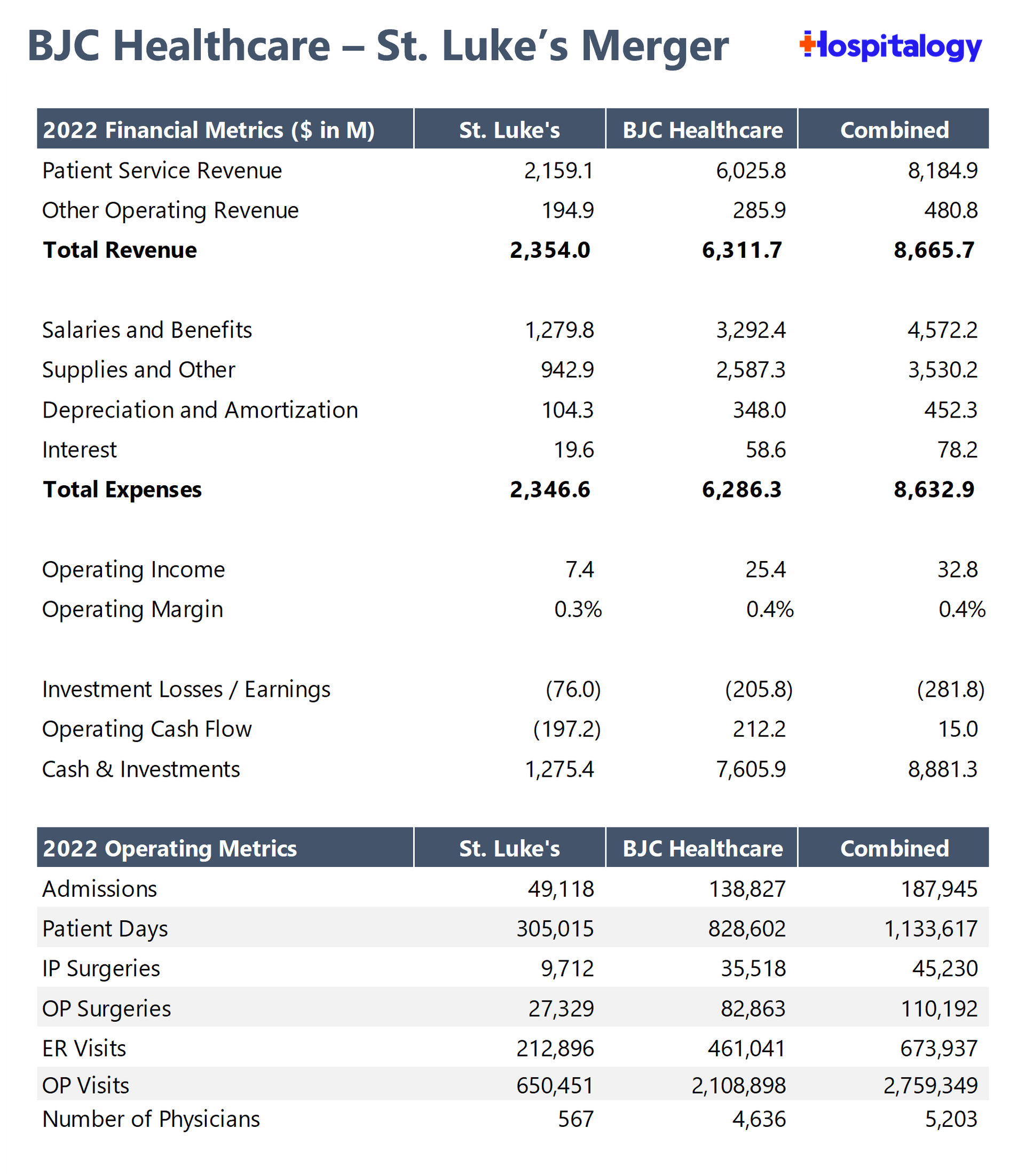 BJC needed an expansion story, and the merger with Saint Luke's grants that. According to credit agency reports, about a quarter of BJC's admissions come from outside of its 11-county primary service area. To me, the signal here is that BJC can leverage Saint Luke's operating footprint to push more patients to its facilities outside of the core market. BJC was already in a healthy financial position, expecting margin recovery this year and holding a nice credit rating from the agencies. If anything, this merger will continue to push that margin further upward after a bad 2022 stemming from labor and inflation issues for hospitals.