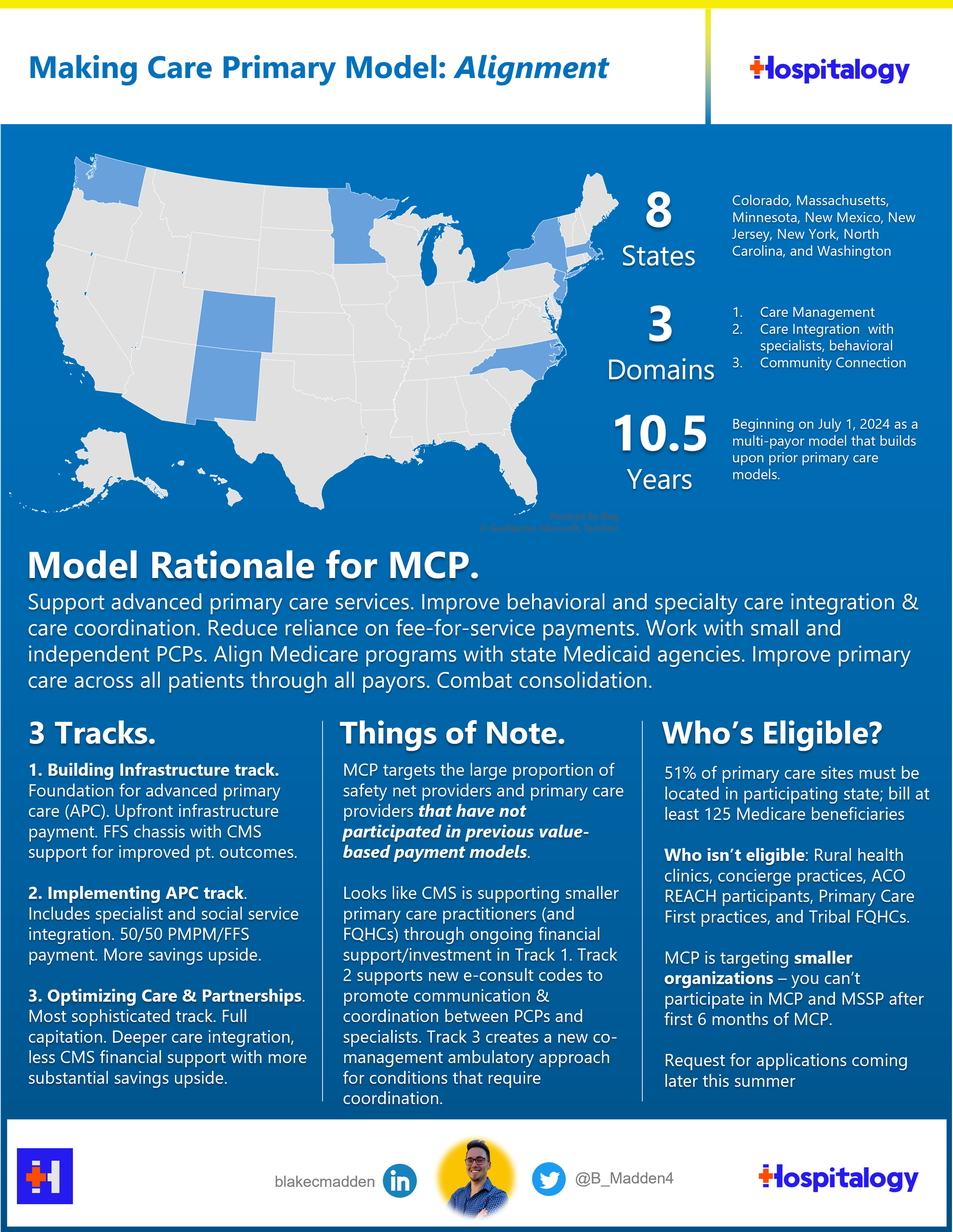 The reimbursement model builds on past iterations of primary care and CMS seems to be targeting anti-consolidation with this one. CMMI is trying to incentivize clinicians who have never participated in advanced primary care, including Federally Qualified Health Centers, supporting these clinicians with boosted infrastructure payments, more hand holding/financial support and 3 tracks that move progressively down toward full risk.
