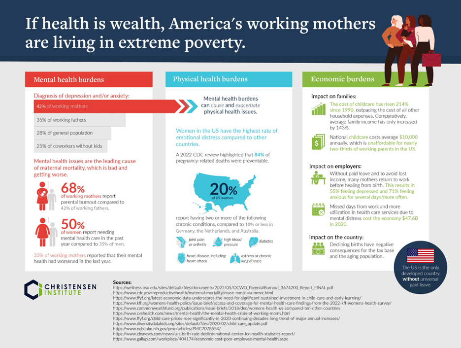 Similar issues burden the broader female population, especially working mothers. While health outcomes and declining life expectancy are plaguing the US population broadly, the infographic below highlights how mental, physical, and economic burdens are disproportionately carried by the working mom. Working mothers are plagued by depression, anxiety, and burnout at higher rates than both working fathers and coworkers without children. Adding insult to injury, mental health issues are the leading cause of maternal mortality, which the CDC recently identified as preventable in 84% of cases. Health issues are compounded by economic distress, such as the cost of childcare, which has risen 214% since 1990, while average family income has only risen 143%. |