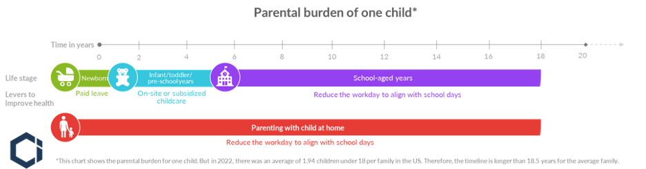 When it comes to poor and worsening maternal health broadly, especially for working moms, our society is—and has been—in the lower left-hand quadrant. That means we don't hold shared goals for maternal health, nor do we agree on what to do to improve it. Looking specifically at the health care industry, we are in a slightly different circumstance: the Leadership Tools quadrant. This is because industry stakeholders have broad consensus around a goal to have enough caregivers to sustain care provision both today and into the future. But we don't yet have consensus on cause-and-effect; that is, how we can achieve that goal. This is where we need a forward-thinking health care entity to take the lead and role model a way forward for the industry. By prioritizing women's health—and therefore, that of the nursing population—and instituting company policies that promote women's health, not detract from it (i.e., working fewer hours, flexible work, affordable childcare, paid leave, etc.), leading organizations can demonstrate how their approaches reduce workers' stress and burnout, and therefore, keep more women, working mothers, and nurses in the workforce. The Path Forward In my recent in-depth report on the topic of working mothers' health outcomes, If health is wealth, America's working mothers are living in extreme poverty: A framework for proper diagnosis and effective treatment, I provide detail on why the various national policy levers we have attempted to use to improve conditions for working mothers and parents more broadly have failed. With limited space here, I'll focus on what health care executives can do to right the ship and not only achieve the goal of sustaining care provision, but do it while achieving other key objectives of improving women's health, enhancing their bottom lines, and boosting employee engagement. Looking at the typical timeline of parenting in the US (see chart below), the most effective lever to reduce maternal stress over the longest time period would be to reduce the misalignment between work and school calendars. In essence, this would involve reducing the average workweek from 40 hours down to about 30 hours, or for those working 12-hour nursing shifts, from 36 hours down to 30. |