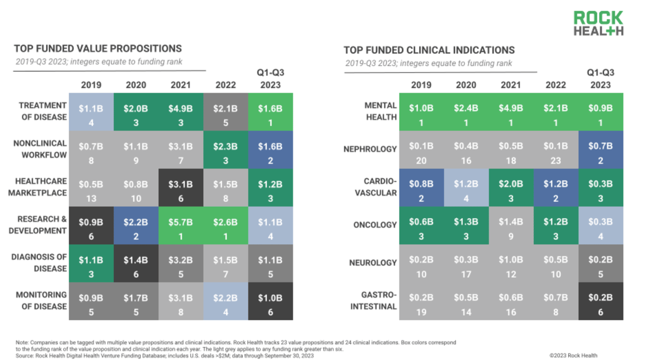 Looking at the past few quarters, it appears that investors are especially enthusiastic about ventures using technology to treat disease, and to make non-clinical workflow, like managing the distribution of durable medical equipment, more efficient. And mental health ventures are still taking home a large chunk of the venture checks.