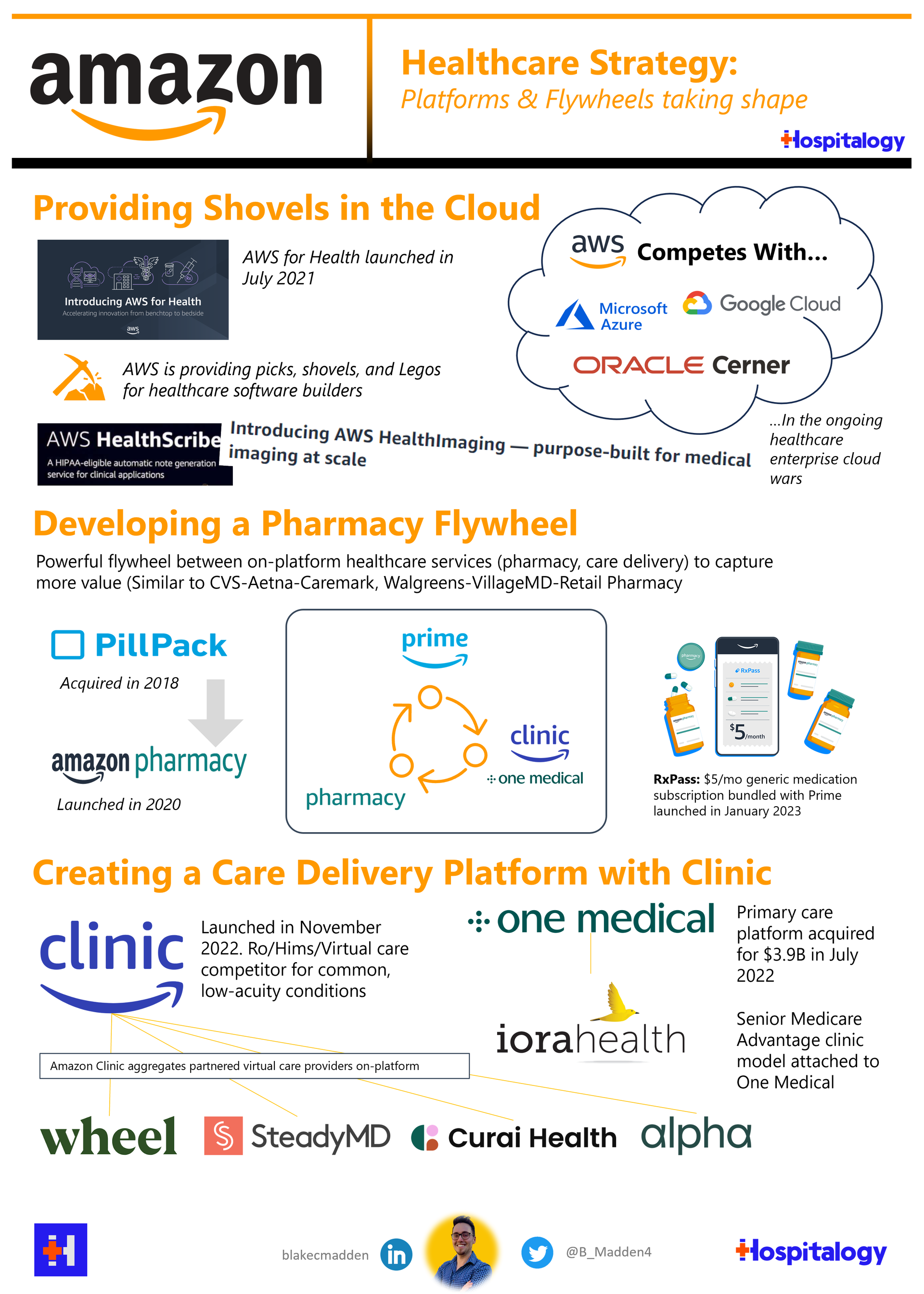 Amazon is building a consumer-focused healthcare platform If they're not already, Amazon is headed toward being a consumer-focused healthcare platform, making long-term investments and product launches into the space: - Amazon Clinic as white-labeled telehealth solution for low acuity services