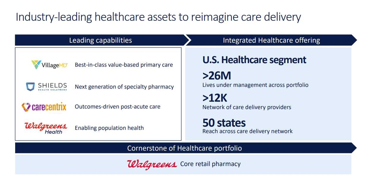 Walgreens is trying to sell the healthcare transformation story Walgreens is an interesting one. For one, they have massive national presence through their retail pharmacy footprint, but growth in that segment is stagnant to declining. Two, they own around 53% of VillageMD, a massive payor agnostic healthcare player in both urgent care, senior clinics, and multispecialty physician services. Three, they've cobbled together some other interesting non-VillageMD assets around population health, specialty pharmacy, post-acute care coordination, and at-home services. |