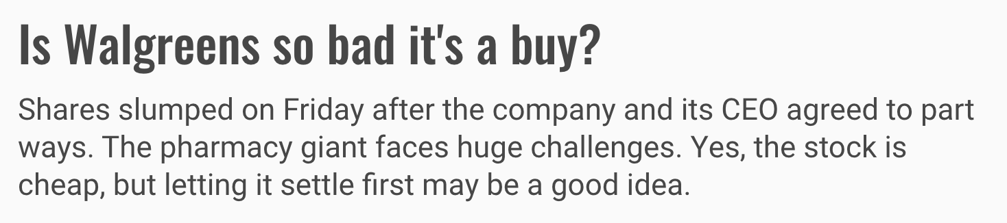 But here's the big picture - Walgreens is floundering entering 2024. Hard. As it turns out, selling a turnaround transformation by leaning into healthcare is pretty difficult. A transformation like one Walgreens is undertaking doesn't happen overnight, and there's a healthy amount of skepticism. After a massive decline in stock price, along with announcing a CEO transition right after a dismal quarter, the writing is on the wall, and leading to unfortunate headlines like this: | So…what in the world happened to Walgreens to get us to this point? Major VillageMD Scaleback to focus on market density: After a long period of clinic expansion including an $8.9B purchase of Summit Health (where integration efforts are likely taking their toll), VillageMD is exiting certain markets including Indiana as part of its announced cost cutting plan from October 2023 in an attempt to create a profitable, sustainable healthcare player. The struggling retail pharmacy chain plans to cut up to $1B in costs enterprise-wide, drop CAPEX by $600M, close 200+ stores, and also close 60 VillageMD locations across 5 markets to focus on VMD's density in existing markets. A new leader at the helm: Walgreens also announced the hiring of Tim Wentworth as CEO, who holds substantial experience in healthcare at both Evernorth and Express Scripts, and knows the PBM space intimately. New telehealth service: Finally, Walgreens launched a DTC telehealth offering in 9 states in an almost exact replica of Amazon Clinic - cash pay, no insurance, etc. Pearl Health Partnership: The most interesting announcement by far to me was Walgreen's decision to partner with Pearl Health, a physician enablement player primarily focused on ACO REACH to this point. On September 12, Pearl announced a strategic collaboration with Walgreens. While the details surrounding the partnership itself were a bit high level, Pearl just set itself up for potentially a huge win with a national player that owns one of the largest healthcare delivery organizations in the country in VillageMD. Here's the initial scope of the capital-light joint venture: - Pearl: will provide its tech and analytics to identify patients that can benefit from Walgreens-led healthcare programs