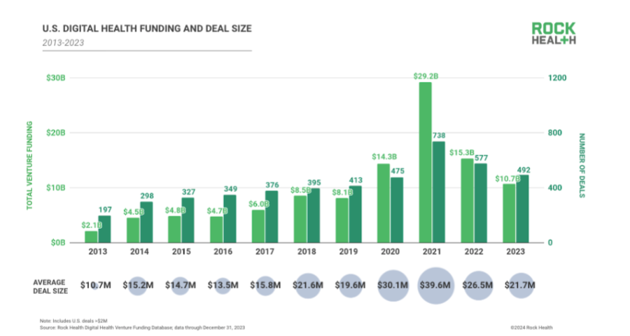 Rock Health crunched the numbers and they're a little bleak: venture funding for digital health startups in the U.S. clocked in at $10.7 billion across almost 500 deals, which is the lowest yearly total in four years. The final quarter of 2023 was the lowest since 2019's third quarter at just $1.9 billion across 122 deals.