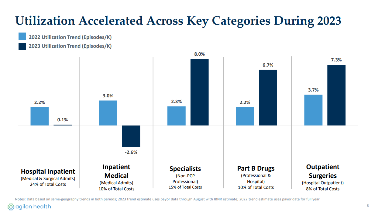 - "For MA, we did observe an increase in utilization during May and early June…This was contemplated in our guidance, and trends moderated back towards normalized levels during the third quarter." agilon Q3 2023 earnings call