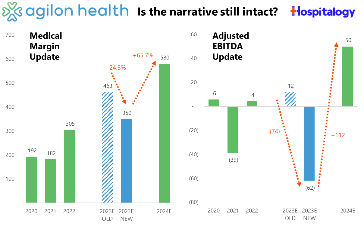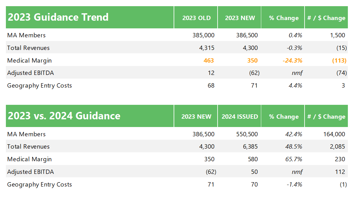 After disclosing the big miss 5 days into 2024, agilon lowered its 2023 guidance, cutting medical margin expectations by $113 million (24%) and adjusted EBITDA by $74M. It now has a steep hill to climb to hit 2024 numbers, a key year when many of agilon's existing market cohorts reach maturity and profitability for the firm, and a year that it sorely needs to achieve cash flow positivity. The whole fiasco is a hit to agilon's forecasting credibility: |
