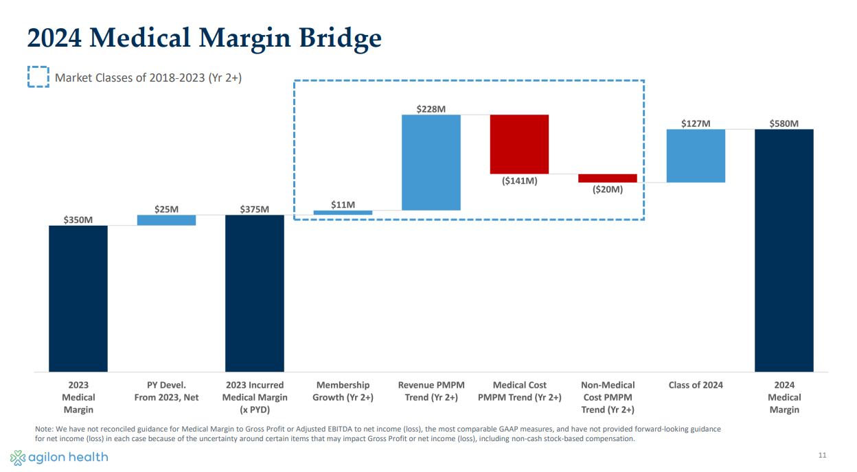 "In fact, when we look at outpatient surgeries like hips and knees, we believe we are about 60% of the way through a backlog of pent-up demand from COVID." "Higher cost trends became visible to us starting in mid-December, as we closed our November results. We recognized at that time that we were seeing cost trends that were 2 to 3x higher what we had seen in 2022." "Given the lower baseline and the elevated utilization assumption for 2024, we have made the decision to withdraw our 2026 outlook." "…due to the much lower 2023 guidance that we just put out, our projection of getting to positive cash flow in 2024 is going to be pushed out to 2025.'" my emphasis added So the TL;DR is that agilon had an above 5% medical cost trend in 2023 it wasn't aware of since it received claims data a few months after the fact. agilon had no idea any of this utilization - 2 to 3 times higher than that of 2022 - was happening in its medical membership until December: |