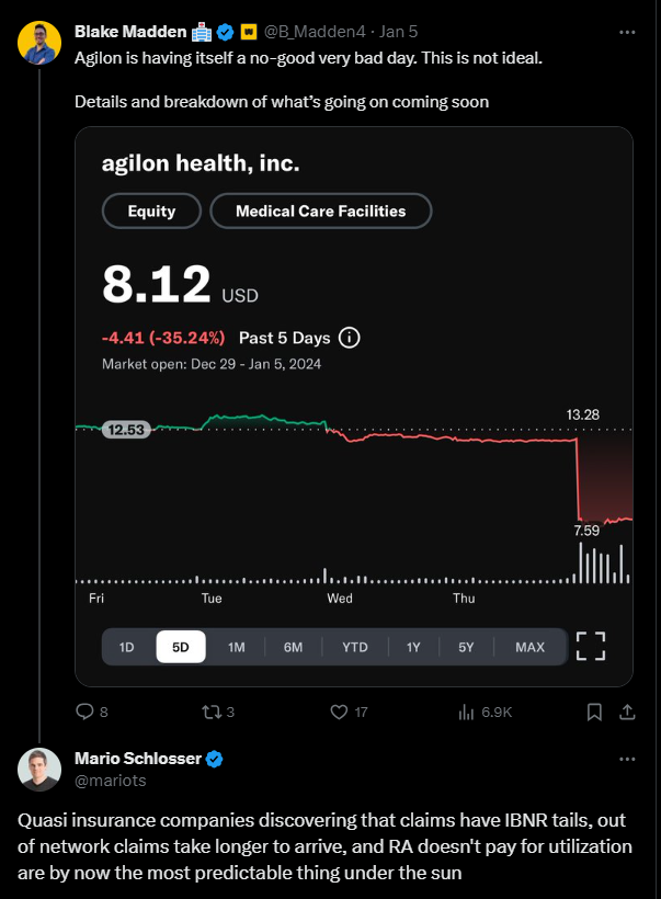 As it turns out, agilon - a ~$5B enterprise (well, now $3.2B) - was flying blind for much of 2023 with lagging claims data and a poor analytics infrastructure. From the emergency conference call: "During 2023, agilon health experienced an increase in medical expenses attributable to higher-than-expected specialist visits, Part B drugs, outpatient surgeries, and supplemental benefits, partially offset by lower hospital medical admissions…" "…our 2023 underperformance was largely driven by 2 issues: a forecast that failed to recognize these elevated cost trends and a data and analytics gap that led to our being late in both recognizing the magnitude and source of the utilization shifts." - (side note that agilon is about to be flooded with data analytics pitches)