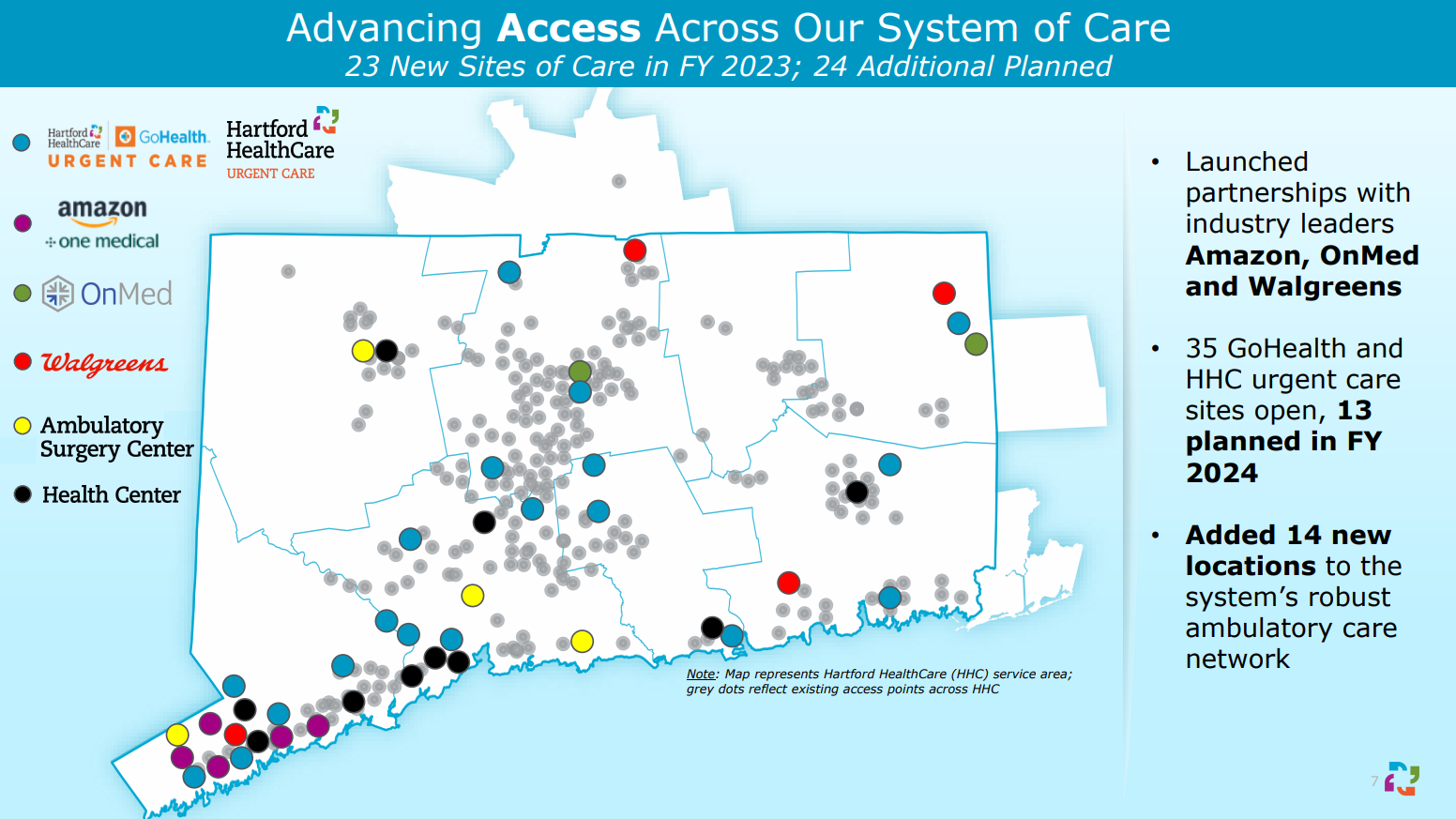 Hartford HealthCare noted several partnerships and 23 new sites of care as part of its Connecticut ambulatory footprint: |