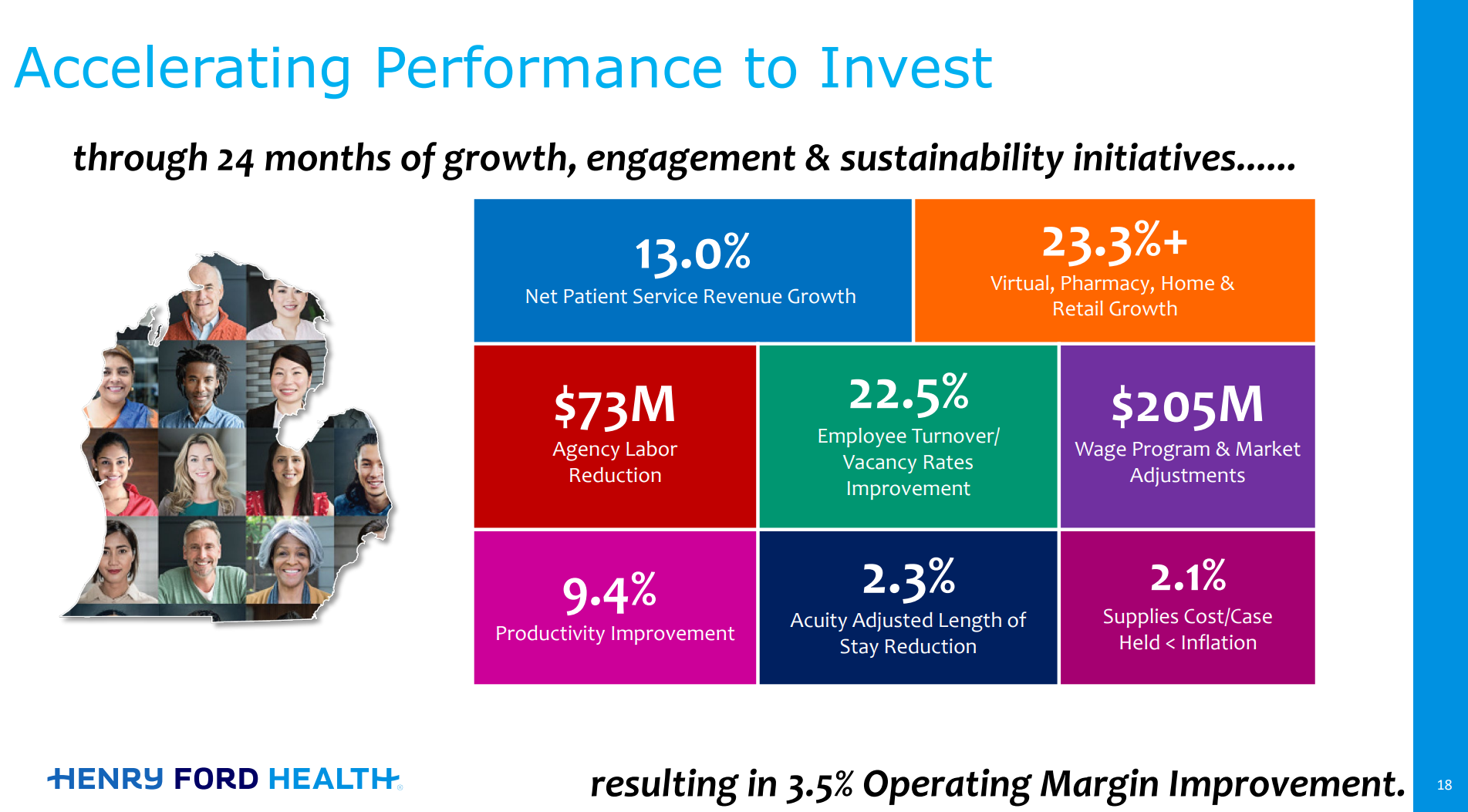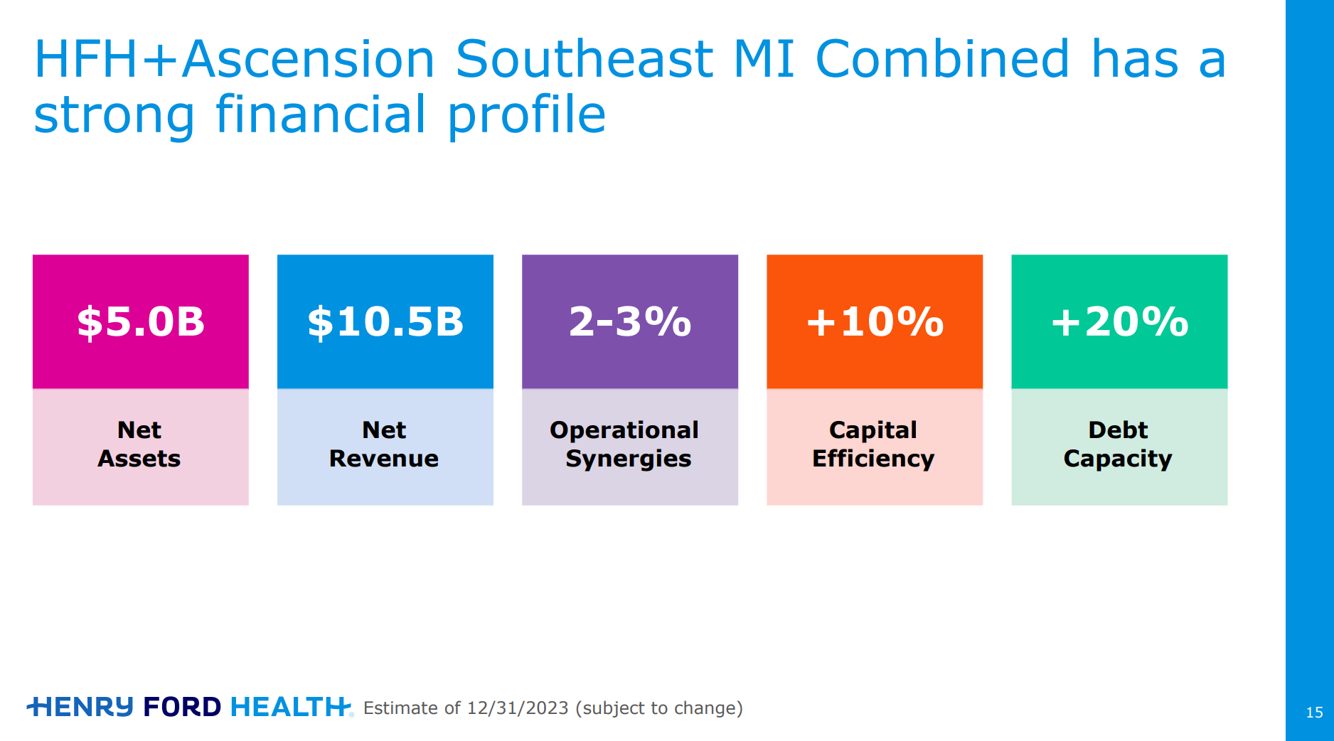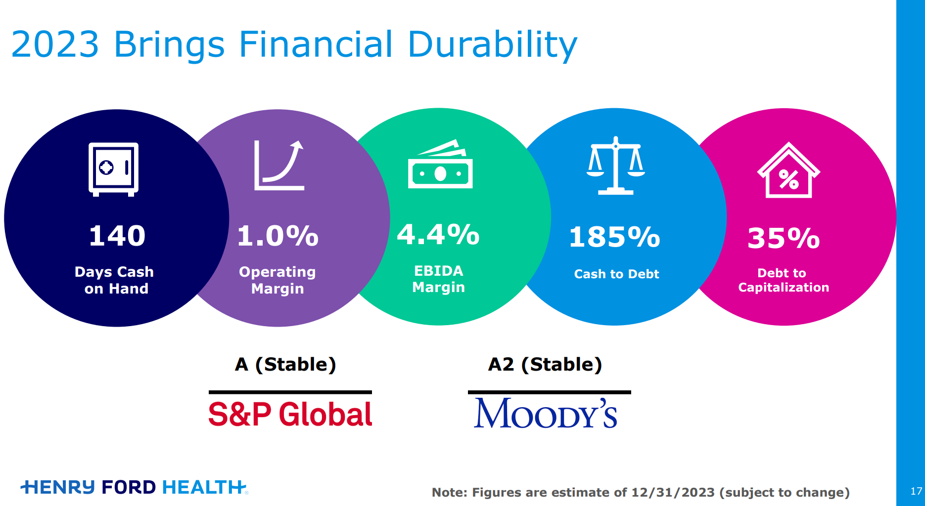 Henry Ford Health rebounded financially in 2023, noting a strong combined profile on the heels of its 'joint venture' with Ascension which included multiple hospitals, a health plan, and other associated assets: |