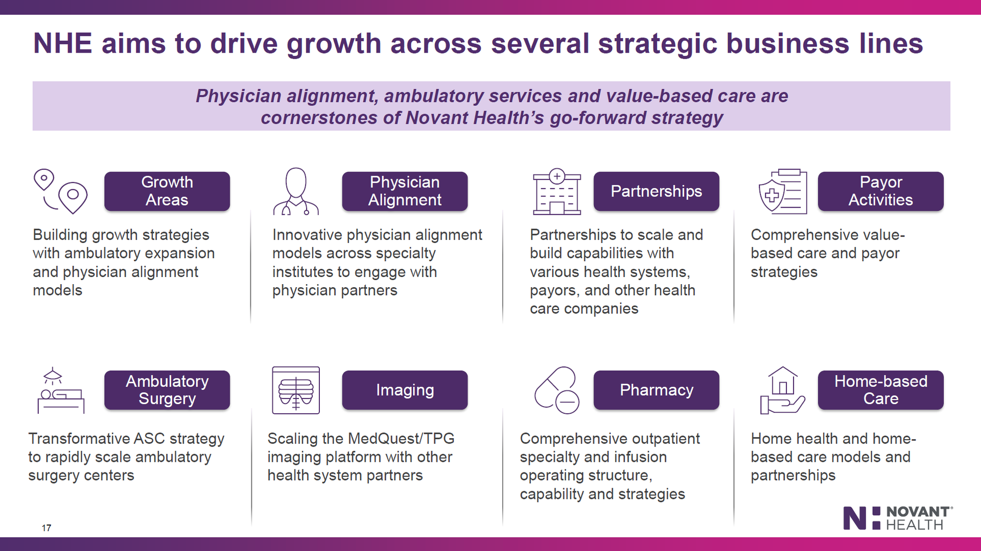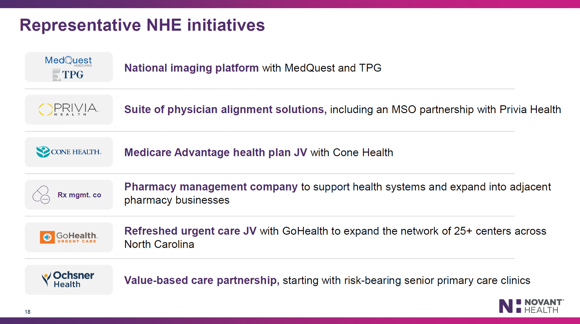 Novant noted several partnerships through NHE with the likes of Privia, GoHealth, and other health systems to develop new downstream referral sources, catchment areas, and population health strategies: |