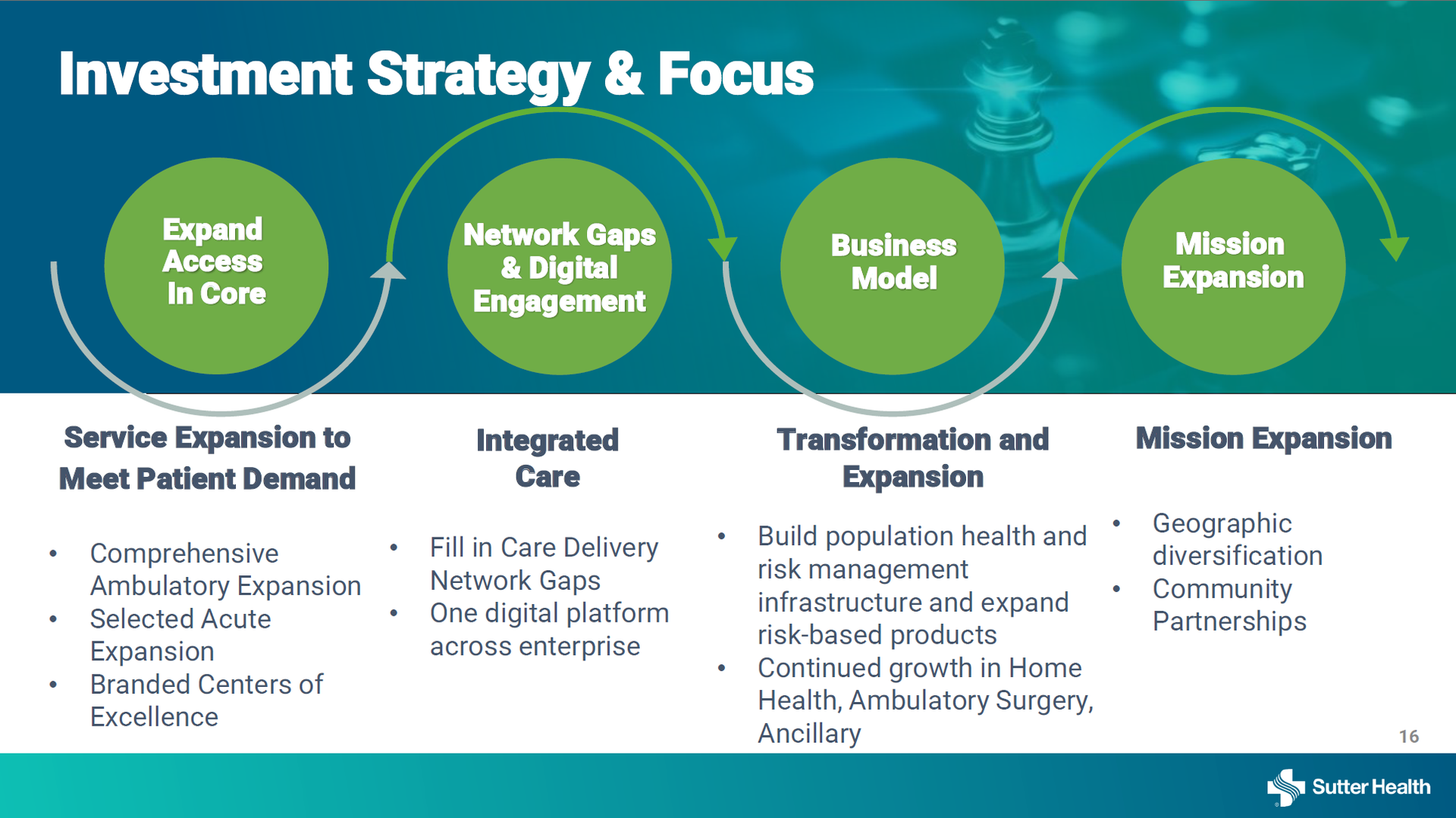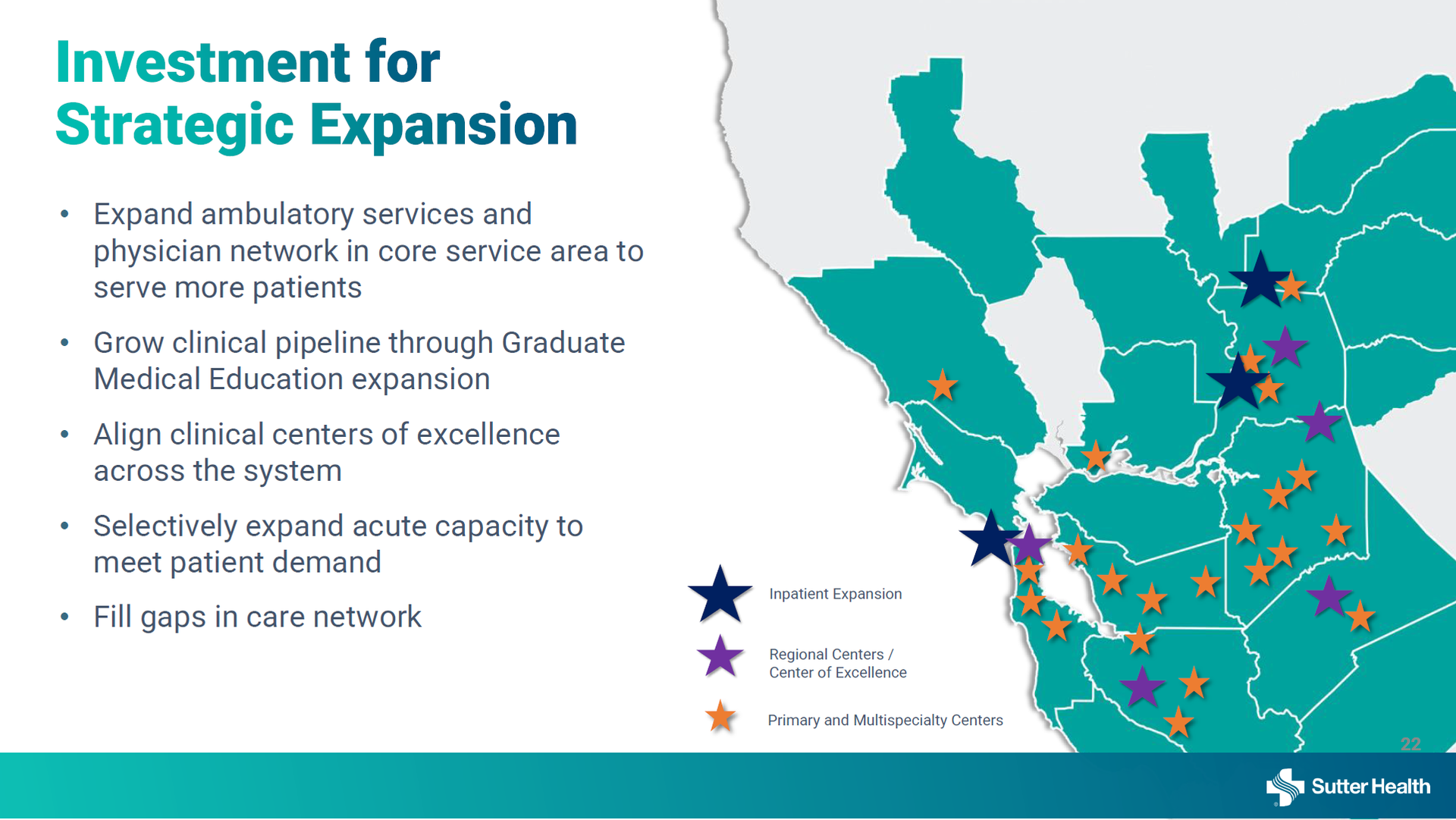 Similarly, Sutter Health wants to continue to fill in gaps in its geography with ambulatory sites of care: |