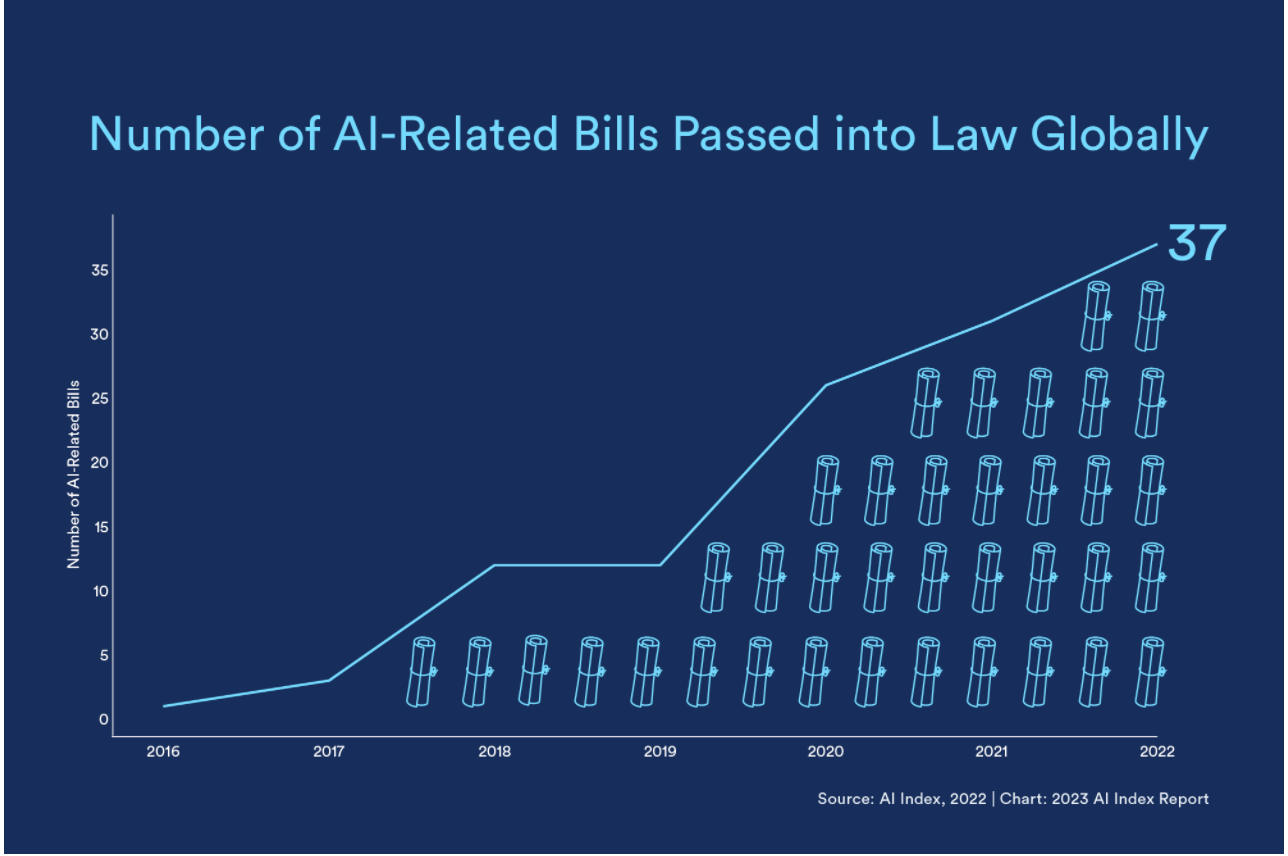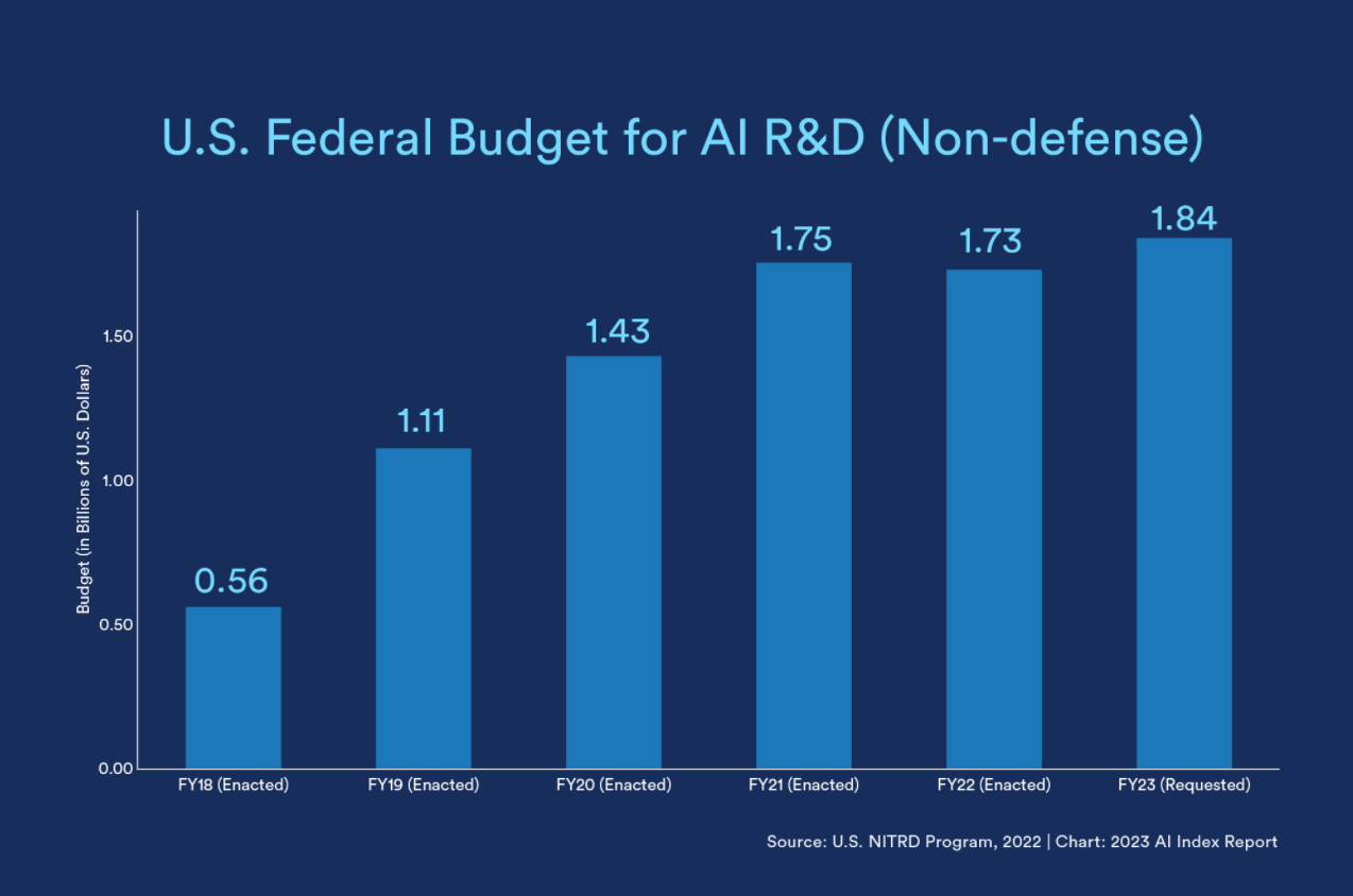 (The above chart from Stanford's Institute for Human-Centered Artificial Intelligence last year captures global regulatory uptick. And U.S. federal budget dedicated to AI R&D has also climbed, as seen below.)