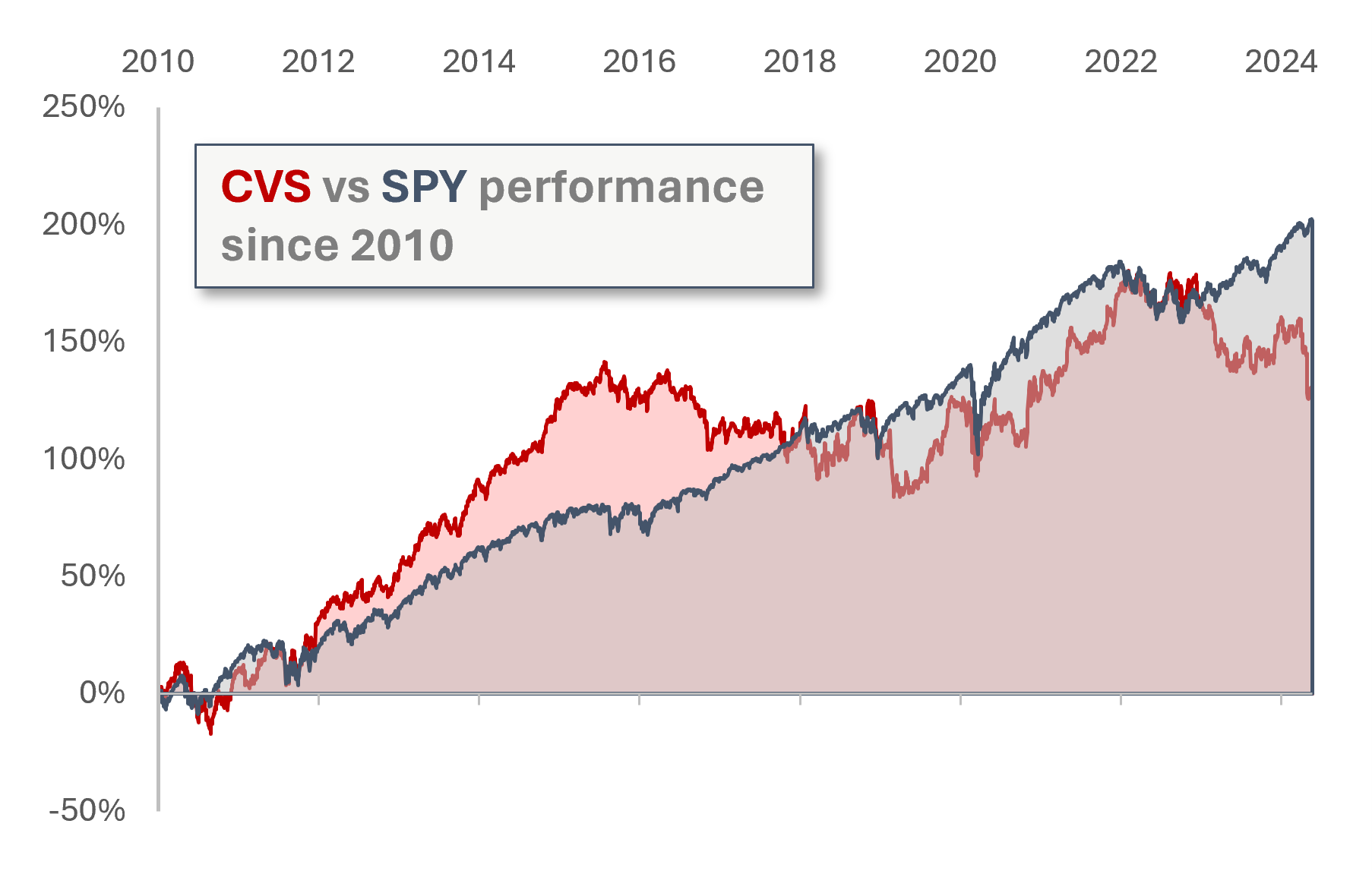Since 2010, an investment in CVS has underperformed the broader market significantly. It was tracking with the market until early 2023. But note the recent drop-off starting in 2023: |
