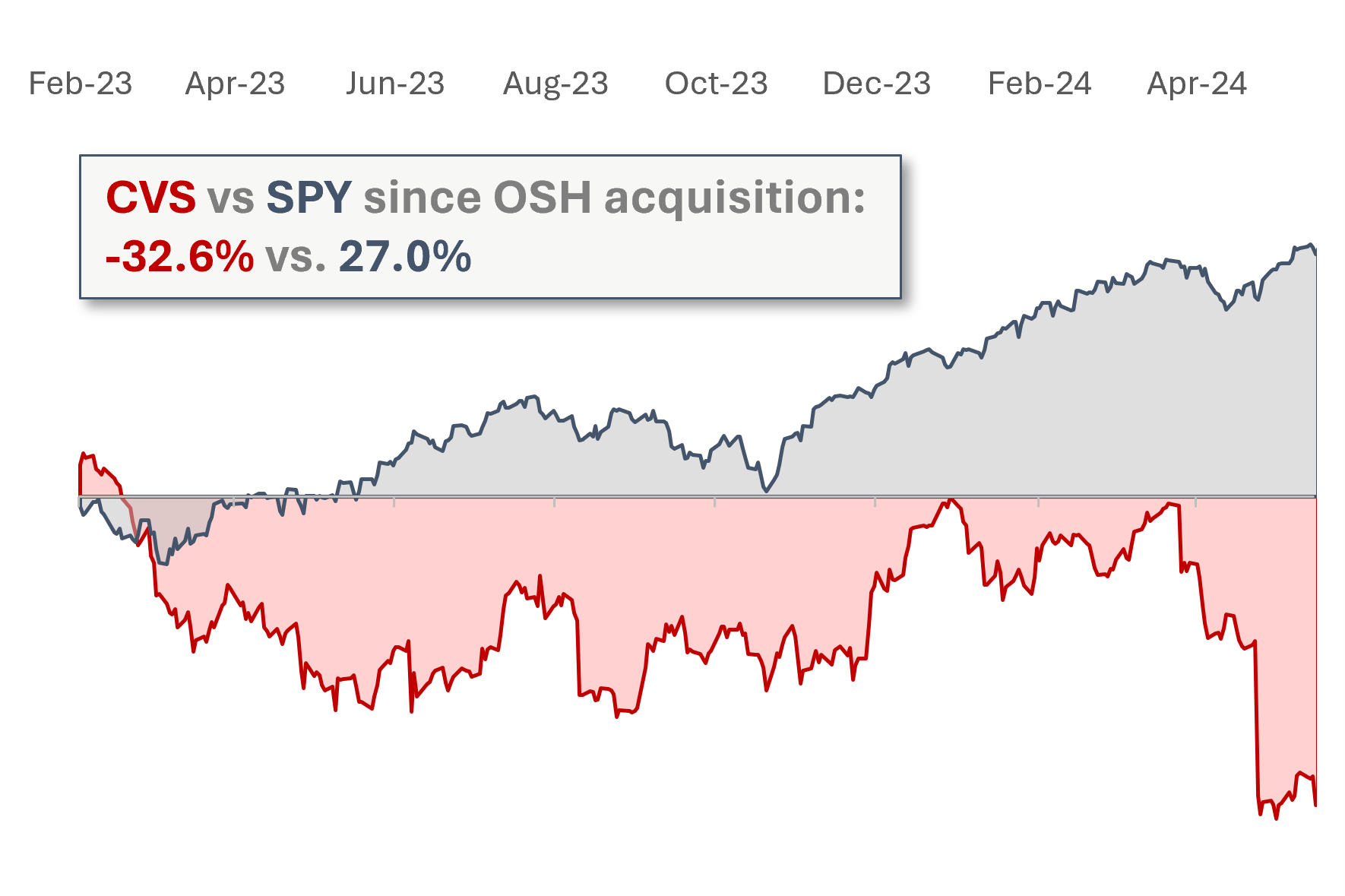 CVS struggles perfectly align with headwinds that began in Medicare Advantage, the decision to acquire Oak Street Health, and generally a rough 2023 including lost Caremark contracts. Finally, we can't forget about the general macro pressures on its retail pharmacy business. Since CVS' acquisition of Oak Street Health (a cherrypicked datapoint, no doubt), the managed care behemoth has returned -32.6% while the S&P 500 is up 27% before dividends. Again - passive investing for the win! |