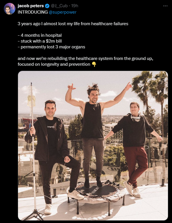 Superpower's launch announcement generated a ton of buzz on social media. The company is looking to build a parallel health system focused on longevity and prevention. The launch in and of itself is a relative masterclass in how to build hype around a new company, as several large investors and folks with large followings commented their support. Here's the full thread, and here is superpower's manifesto. |