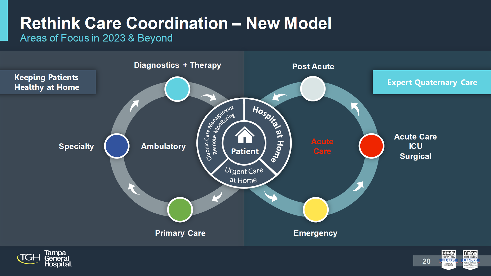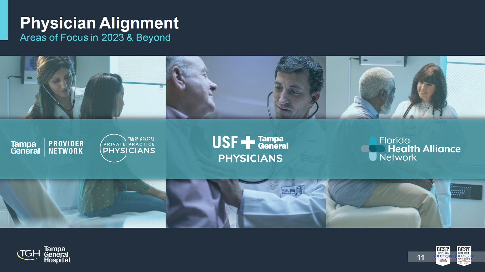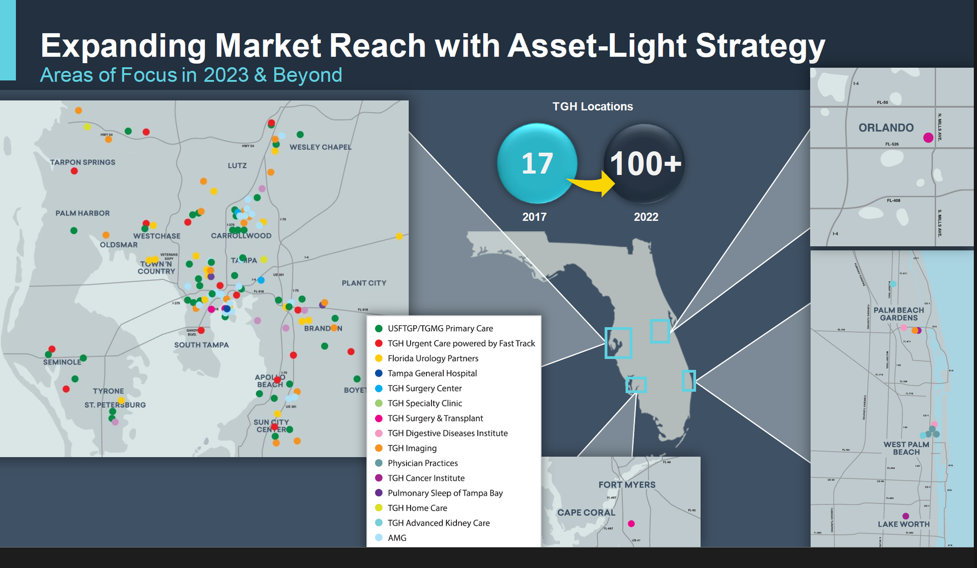 Tampa General (Tampa General, or TGH) sits at $2.2 billion in revenue today and over 8,000 aligned primary care practitioners amid an expansive footprint in Florida: |
