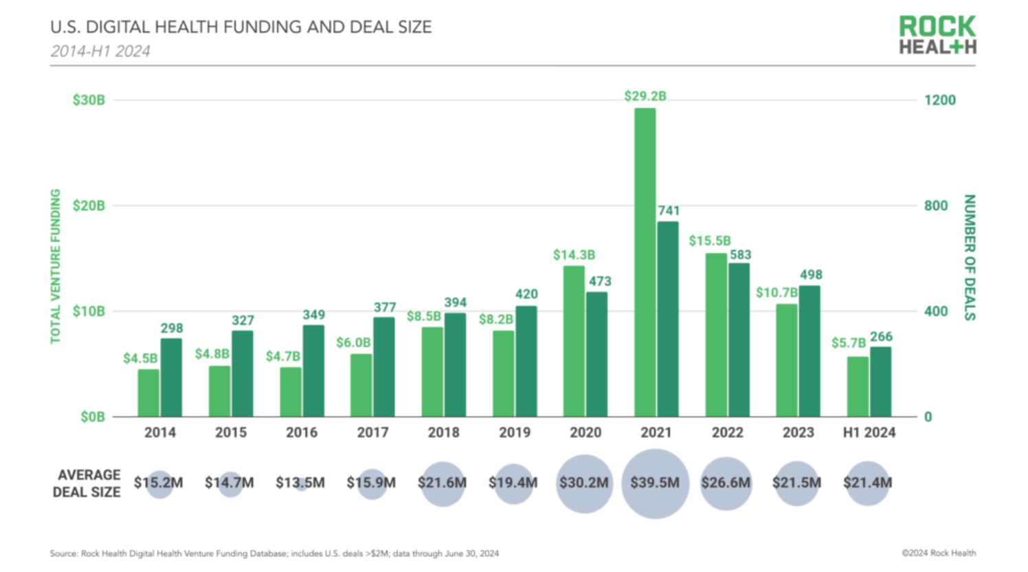 While health tech startup funding is still far below its pandemic peak, data from the first half of this year could spell a comeback — or at least, stability in some markets, my colleague Mario Aguilar reports, citing Rock Health's latest funding readout. Investors poured $5.7 billion into health tech startups in the first half of 2024. That compares to the $10.7 billion invested in the sector in all of 2023.