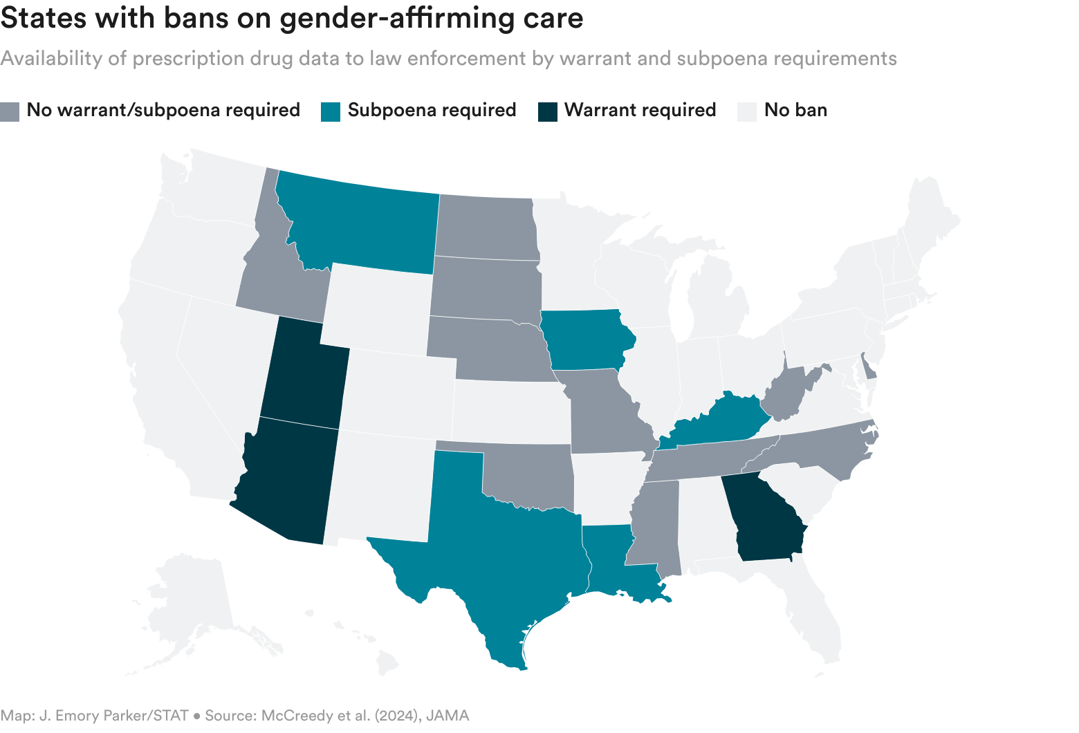 Only 11 states require law enforcement to obtain a warrant before accessing prescription data, while 14 require a subpoena. (At the federal level, drug enforcement can always access this data without a warrant.) More research is needed to better understand the consequences of this access, the authors write — in particular, whether the data is being used to enforce bans on gender-affirming care.