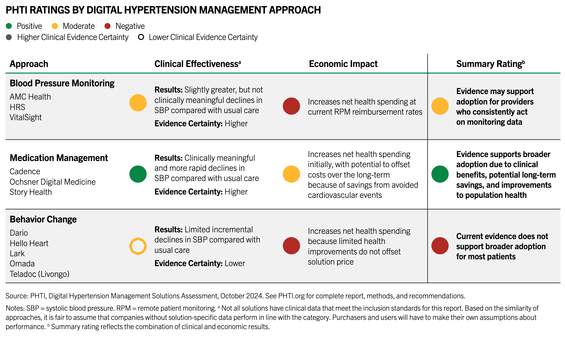 Digital health evaluation nonprofit the Peterson Health Technology Institute takes aim at the burgeoning market for hypertension treatment and management in its latest report, and it isn't all good news for the companies hawking digital blood pressure cuffs, remotely observing levels, managing patients' medication regimens, and using technology to nudge patients to change their habits such as diet or exercise.
