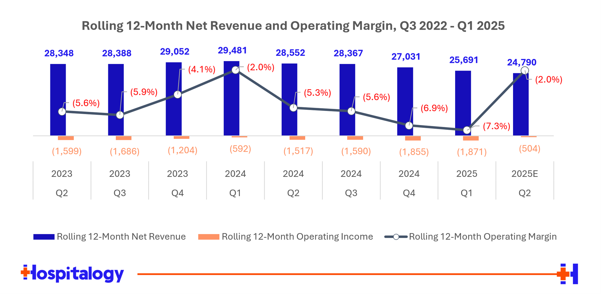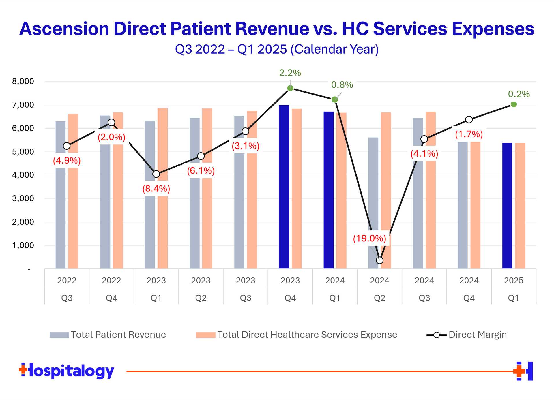 After getting through that laundry list of deals, you can see Ascension has been one of the more active members of the hospital M&A clan. Adding to the above M&A activity, Ascension also dealt with 2 cybersecurity incidents in 2024 - one being the Change Healthcare issue, then an isolated event tied to Ascension in mid 2024. In the first three months of 2025 alone, Ascension sold an additional 13 hospitals and acquired one. So using hospital divestitures as a proxy for revenue decline, we should continue to see the health system's expense profile improve as it closes out its fiscal 2025 and moves out of unattractive markets: |