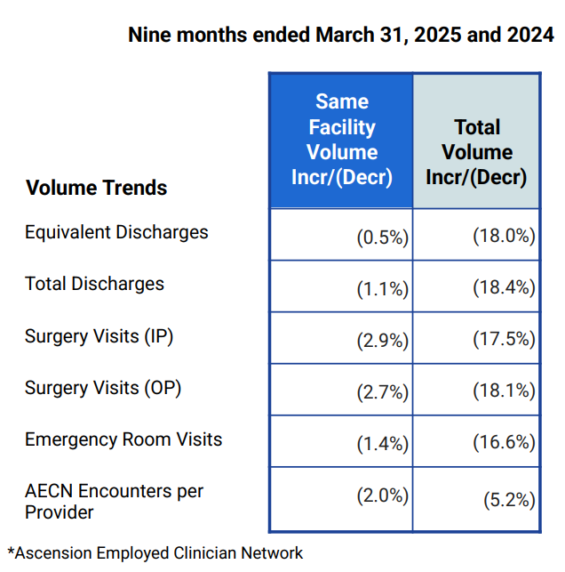 From a volume perspective, on a same-store basis, Ascension noted its volume fell 0.5% compared to the same 9-month prior period, given the variety of disruptions Ascension faced in 2024. I'd expect much stronger numbers next year on an easy comp as these procedural volumes get rescheduled or push outpatient, and you can see that effect in the Q3 numbers on a standalone basis: - "Ascension's same facility volumes for key indicators for Q3 FY25 YTD have generally increased 6-7% on a per-day basis as compared to the comparable per-day volumes during Q4 24 (quarter impacted by the cybersecurity attack). Note that it's important to analyze Ascension volumes on a same-facility basis given the many divestitures."