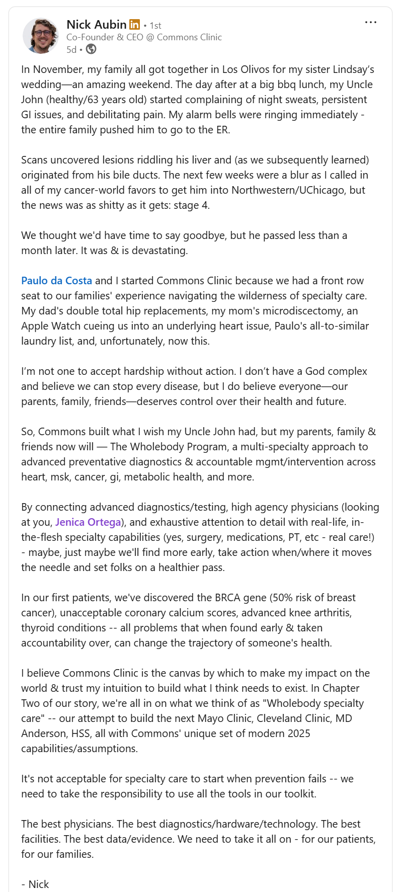 Sorry Nick, no fancy graphic for you…yet. Still, Commons Clinic is one to watch as it announced a $26M Series B this week and unveiled a new preventive, longevity-focused vertical called Wholebody intended to integrate multi-specialty care (CV, MSK, ortho, GI, etc.) with advanced preventative diagnostics to offer Commons patients a connected experience rather than a bunch of lab tests slapped together along with a hasty telehealth visit. As primary care grows to become an embedded commodity, those players with the assets to deliver a seamless, consumer-oriented experience with integration into specialty care will win the day. Commons Clinic is headed down that path. |