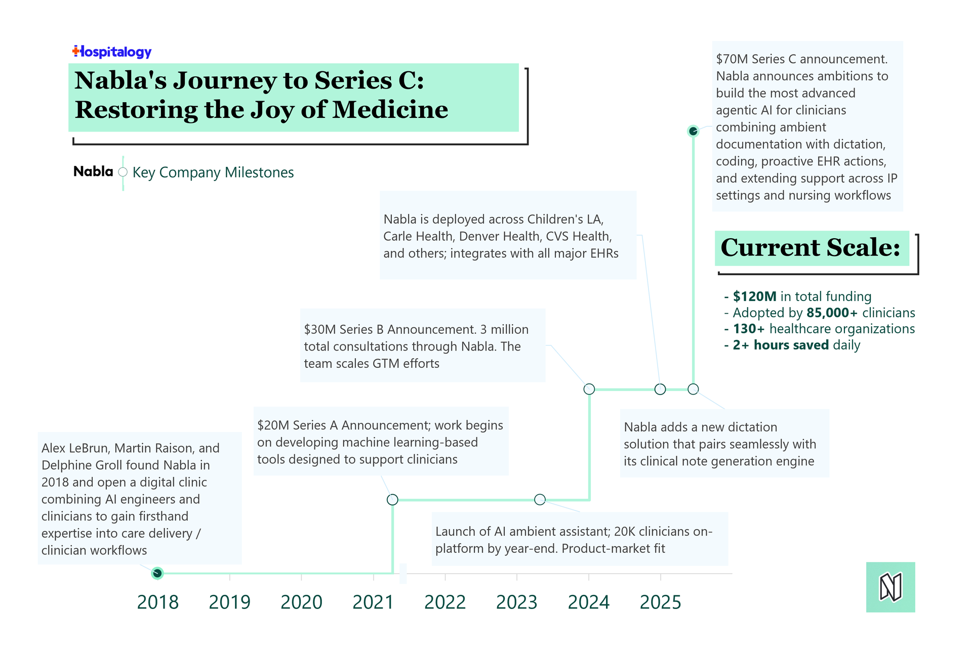 Happy Tuesday Hospitalogists! Today's send a health tech themed, visual-forward breakdown, including some recent fundraising news from Nabla, Sword, Commons Clinic, and others. Also, in case you missed it, I announced my first ever in-person Hospitalogy retreat focused on value-based care. So far we've got planned attendees from AdventHealth, Wellvana, Davita, and more. Networking opportunities, pitch and putt festivities, and themes centered around VBC. Join the waitlist here! |